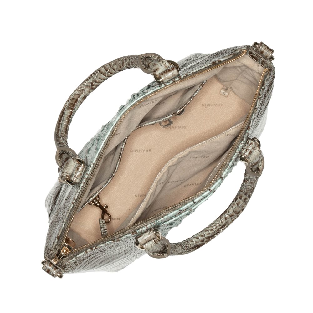 Featured in Bluebell Ombre Melbourne, a neutral ombre that transitions from cool blue to light brown. Genuine croc-embossed leather.