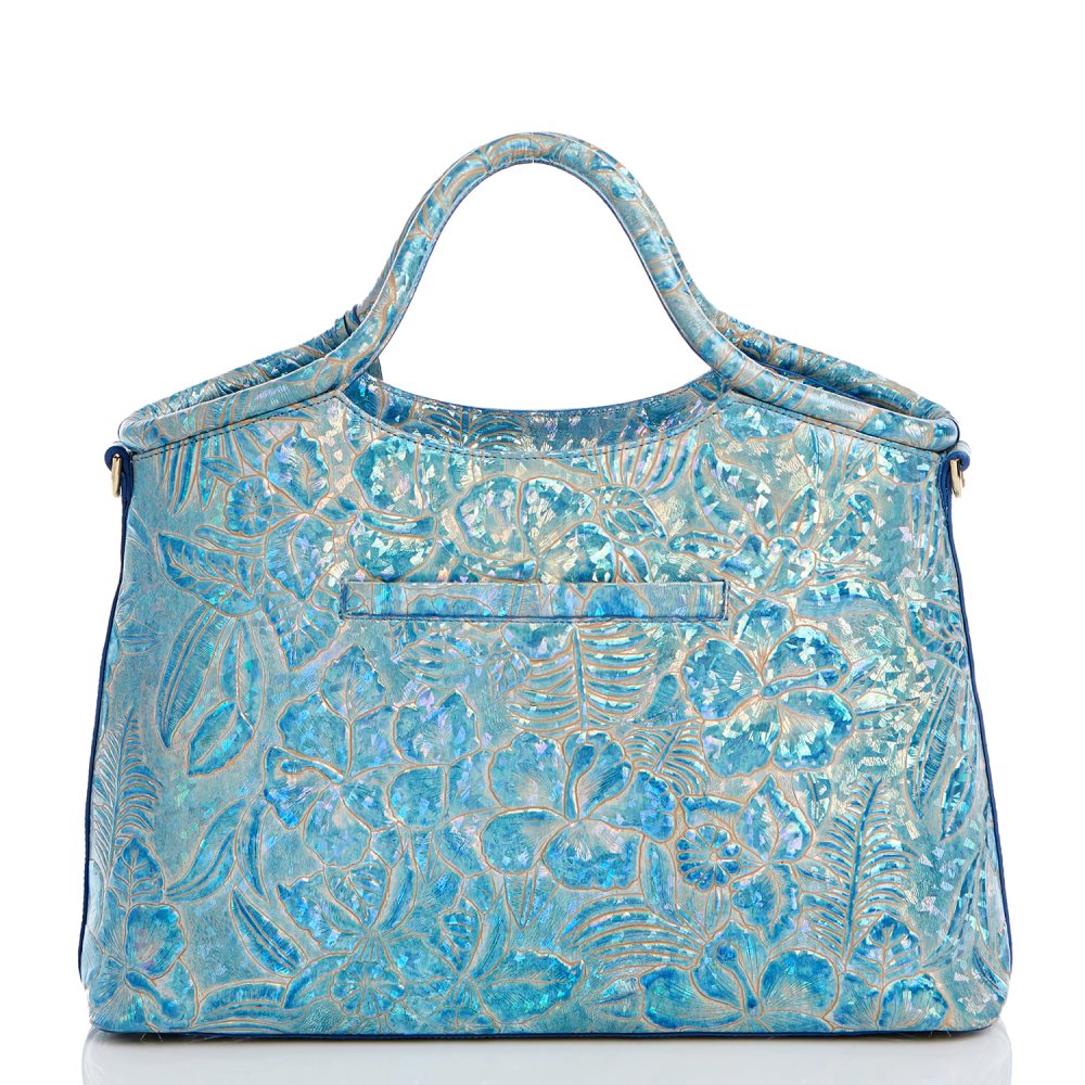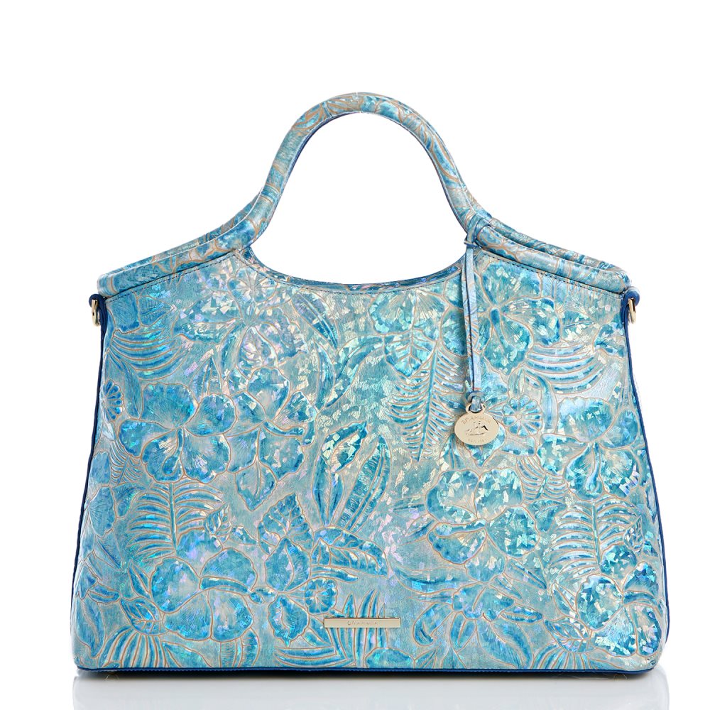 Featured in Serenity Sonic, an embossed holographic novelty print with a floral motif in a refreshing blue colorway. Genuine leather.