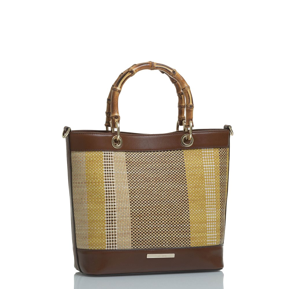 Featured in Multi Isla, a luxe pairing of Italian straw in a retro-inspired pattern trimmed with smooth chocolate brown leather. Genuine leather.