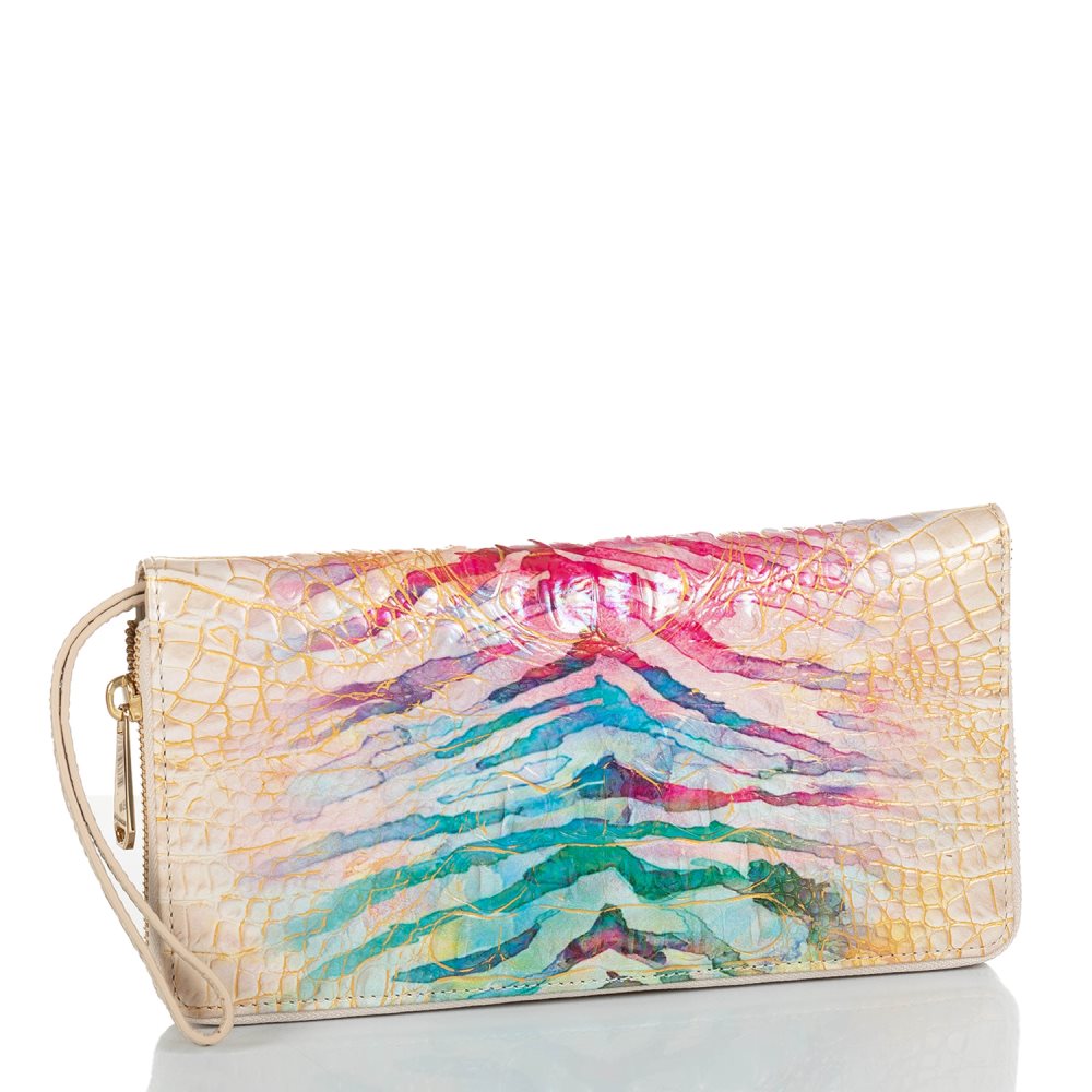 Featured in Entice Ombre Melbourne, a watercolor-inspired print with bold strokes of color on an off-white pearlized base. Genuine croc-embossed leather. Color/design orientation may vary due to uniqueness of our materials.
