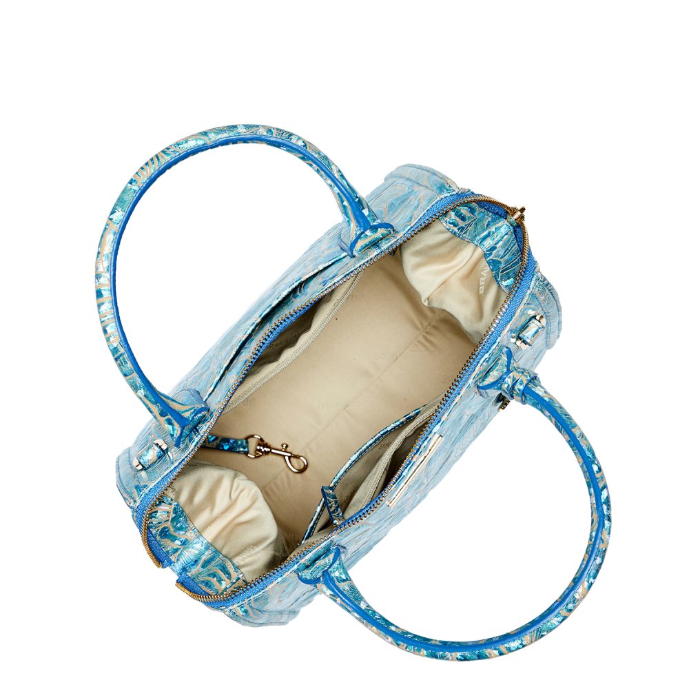 Featured in Serenity Sonic, an embossed holographic novelty print with a floral motif in a refreshing blue colorway. Genuine leather.