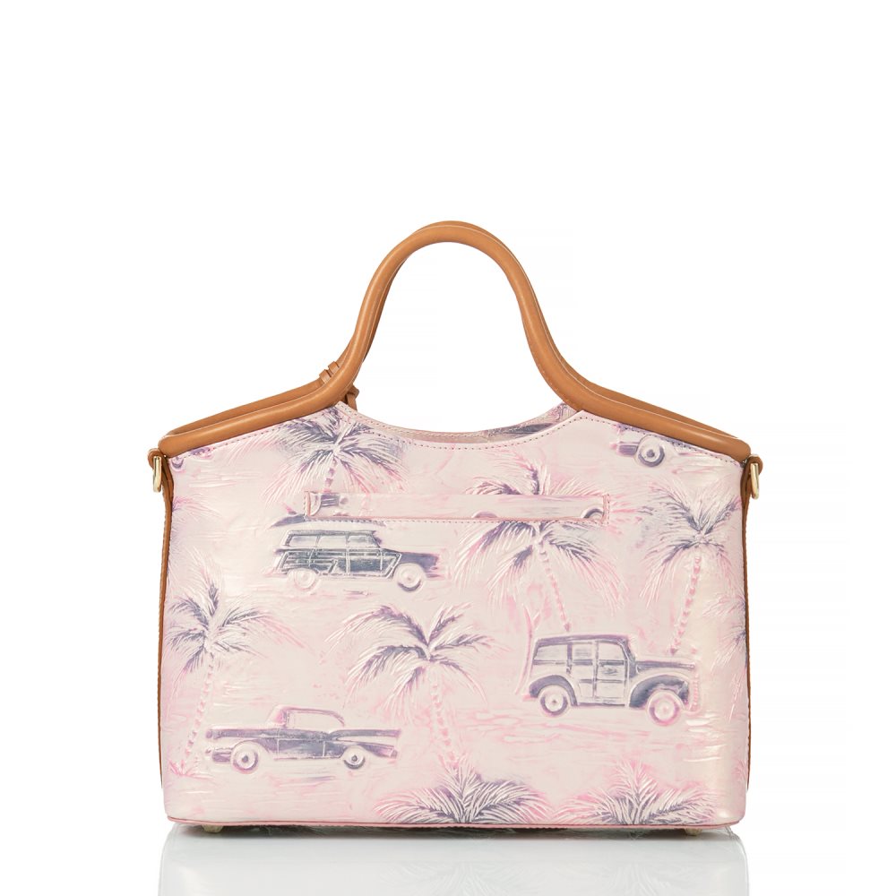 Featured in Optimism Copa Cabana, our fan-favorite embossed novelty print in a soft pink hue with touches of purple trimmed with smooth tan leather. This hand-painted print is a collector's dream come true. Genuine leather.