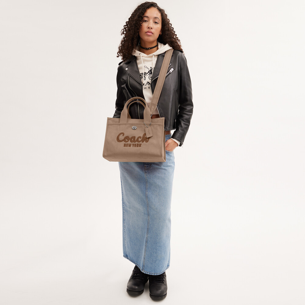 Canvas and grosgrain Zip-top closure, fabric lining Handles with 11.5cm drop Outside turnlock and snap pockets Detachable strap with 61cm drop for shoulder or crossbody wear Fits a 33cm laptop 34cm (L) x 25.5cm (H) x 16cm (W)Carry as much (or as little) as you like with our lightweight Cargo tote. Detailed with our cursive Coach script embroidery and iconic turnlock closure, this spacious carryall has an open interior with room for a 13
