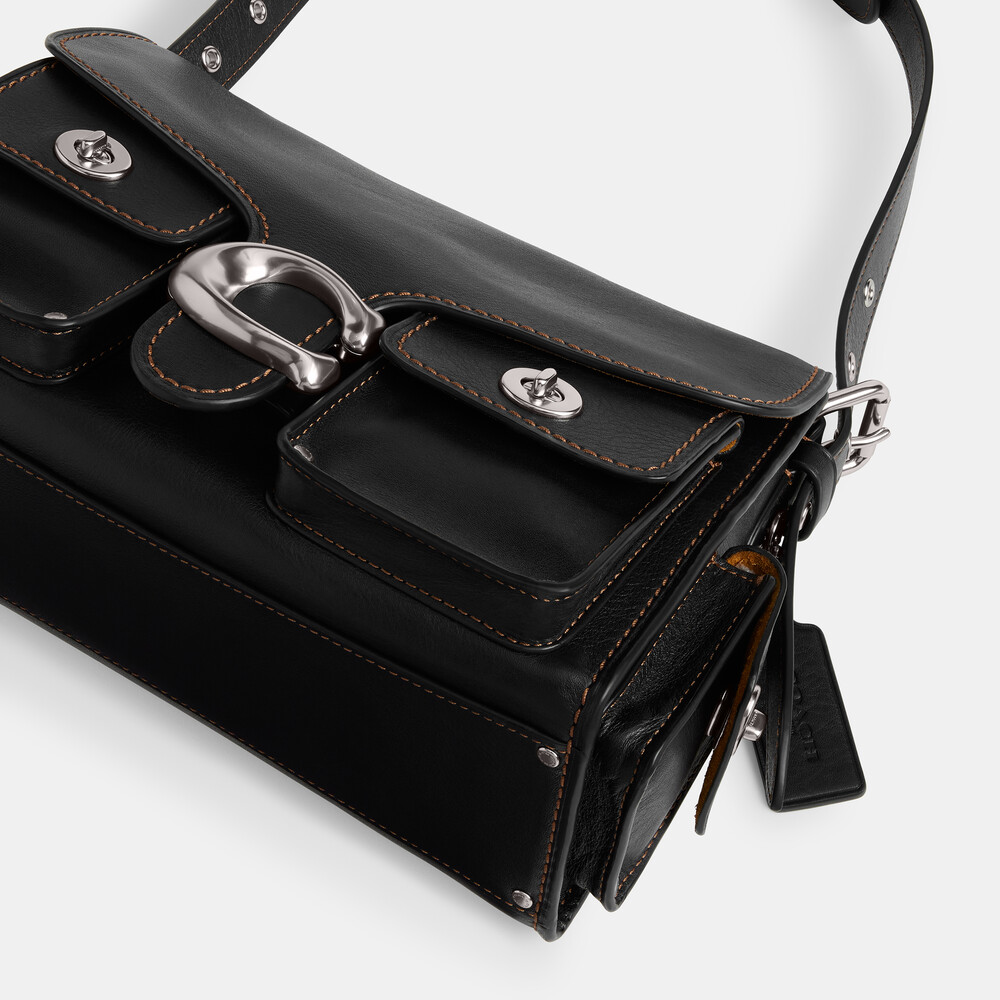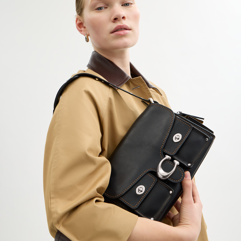 Natural grain leather Inside zip pocket Snap closure, suede lining Adjustable handle with 21.5cm drop Outside turnlock and open pockets Adjustable long strap with 54.5cm drop for shoulder or crossbody wear 26cm (L) x 17cm (H) x 11cm (W)The Soft Tabby reimagines our structured take on an archival 1970s Coach design with a relaxed feel. Finished with cargo pockets detailed with our iconic turnlock closures, polished stud accents and our Signature hardware, this natural grain leather shoulder bag features pockets inside and out to organize small accessories and two straps to carry by hand, style as a short shoulder bag or wear crossbody.