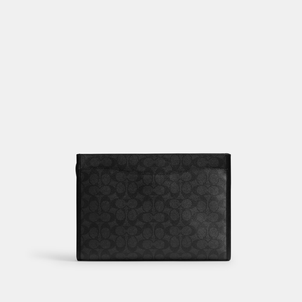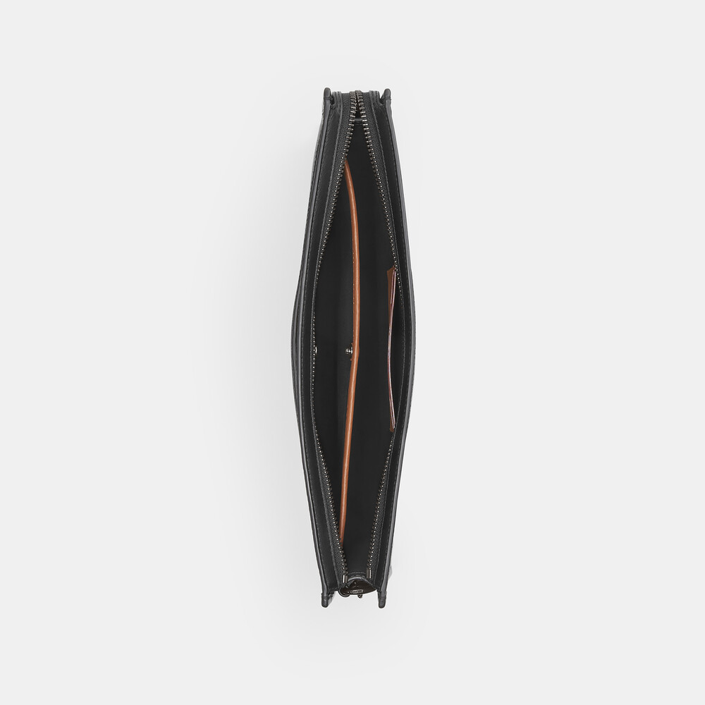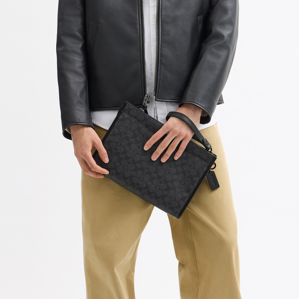 Signature coated canvas and refined calf leather Two credit card slots Inside snap pocket Zip-top closure, fabric lining Outside magnetic snap pocket Detachable wrist strap 30.5cm (L) x 21.5cm (H) x 4.5cm (W)