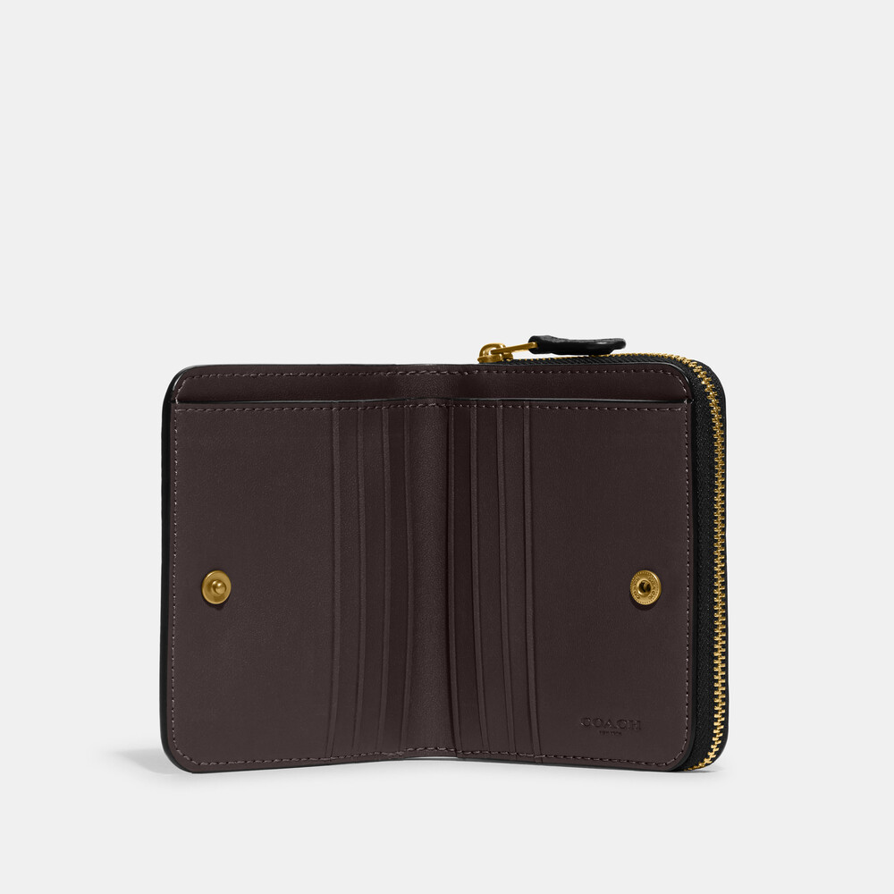 Polished pebble leather Eight credit card slots Full-length bill compartment Snap closure Outside zip coin pocket 11cm (L) x 9.5cm (H) x 1.5cm (W)Crafted of polished pebble leather detailed with our Signature hardware, this compact billfold wallet features a convenient exterior zip pocket for coins, receipts, earbuds and other small essentials. It unsnaps to reveal eight card slots and a full-length bill compartment.
