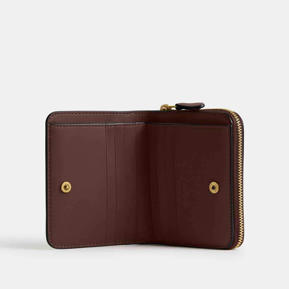Refined calf leather Eight credit card slots Full-length bill compartment Snap closure Outside zip coin pocket 11cm (L) x 9.5cm (H) x 1.5cm (W)Crafted of refined leather, this compact billfold wallet features a convenient exterior zip pocket for coins, receipts, earbuds and other small essentials. It unsnaps to reveal eight card slots and a full-length bill compartment.