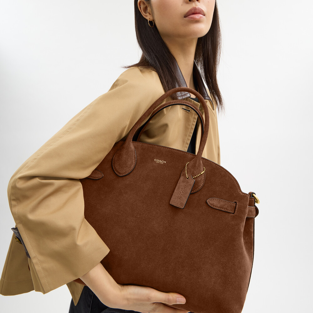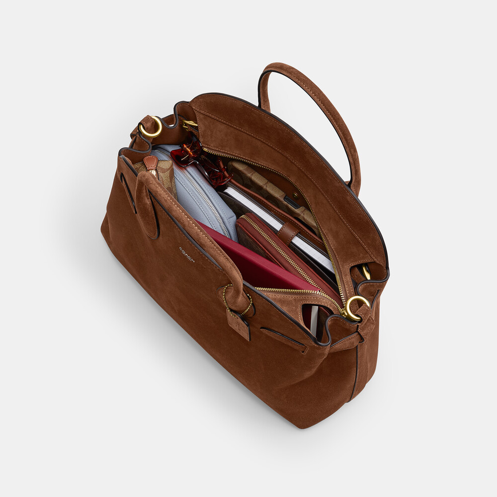 Suede and refined calf leather Inside snap pocket Inside lanyard with dogleash clip Zip-top closure, fabric lining Handles with 11.5cm drop Detachable strap with 54.5cm drop for shoulder or crossbody wear Four protective feet at base Fits a 33cm laptop 40cm (L) x 29cm (H) x 15cm (W)A vintage-inspired silhouette, our Empire Carryall is designed with a New York state of mind