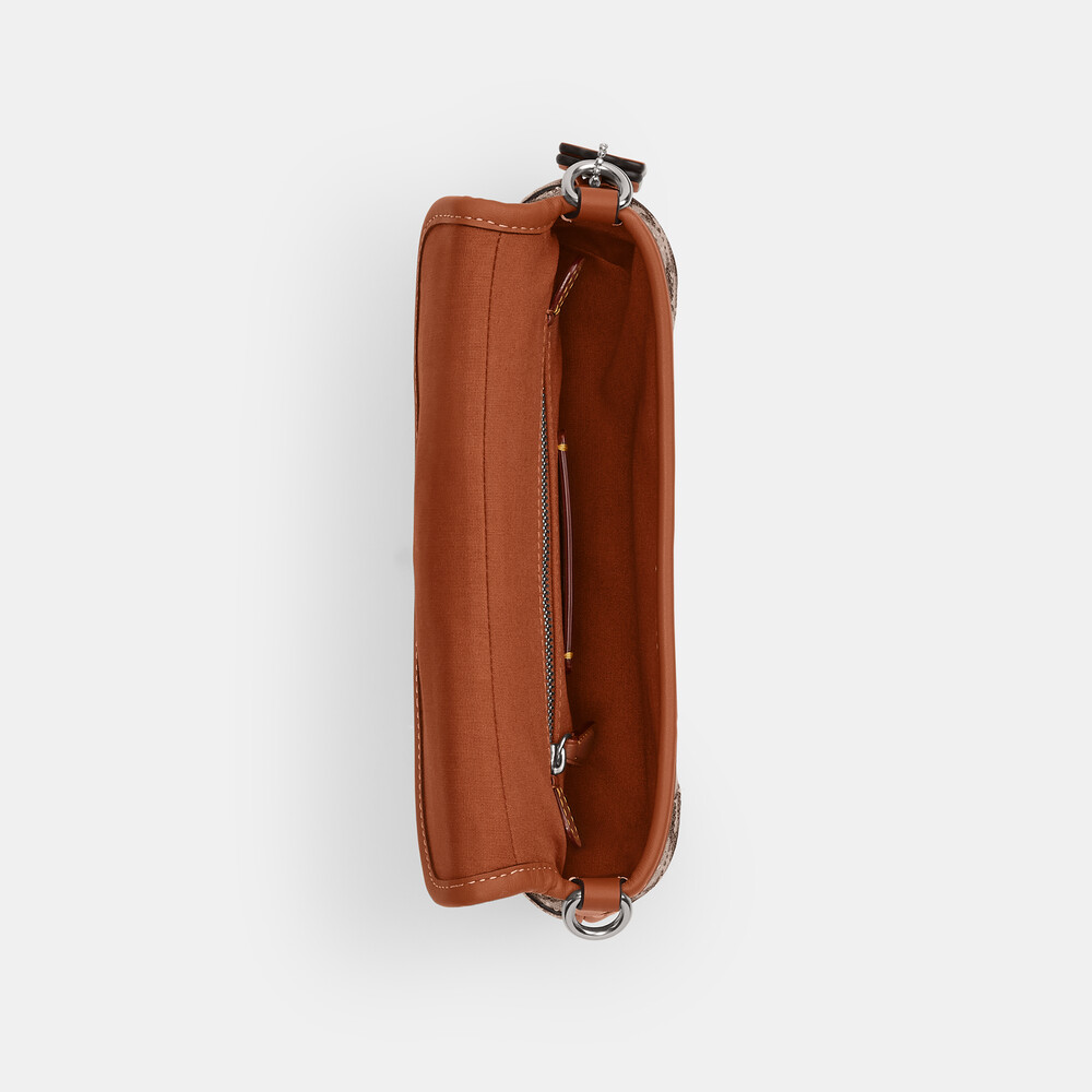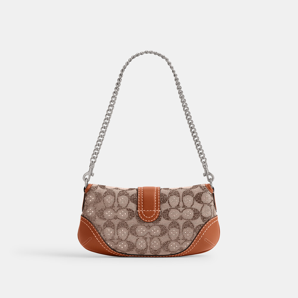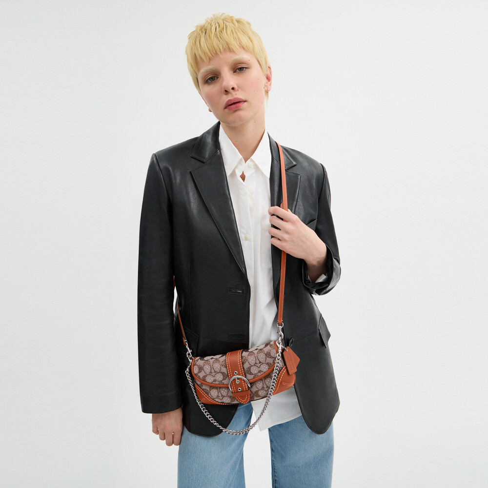 Length: 9.75"Height: 5.0"Width: 2.25"Materials: Signature jacquard and glovetanned leather ,Fabric liningDetachable chain handle with 8.75" dropDetachable strap with 22.25" drop for shoulder or crossbody wearInside zip pocketMagnetic snap closureA slightly smaller version of our iconic 2006 Soho Flap, the Soho Bag 25 is a compact flap-front silhouette crafted glovetanned leather and our shimmery crystal-embellished Signature jacquard. With an inside zip pocket for small essentials, it