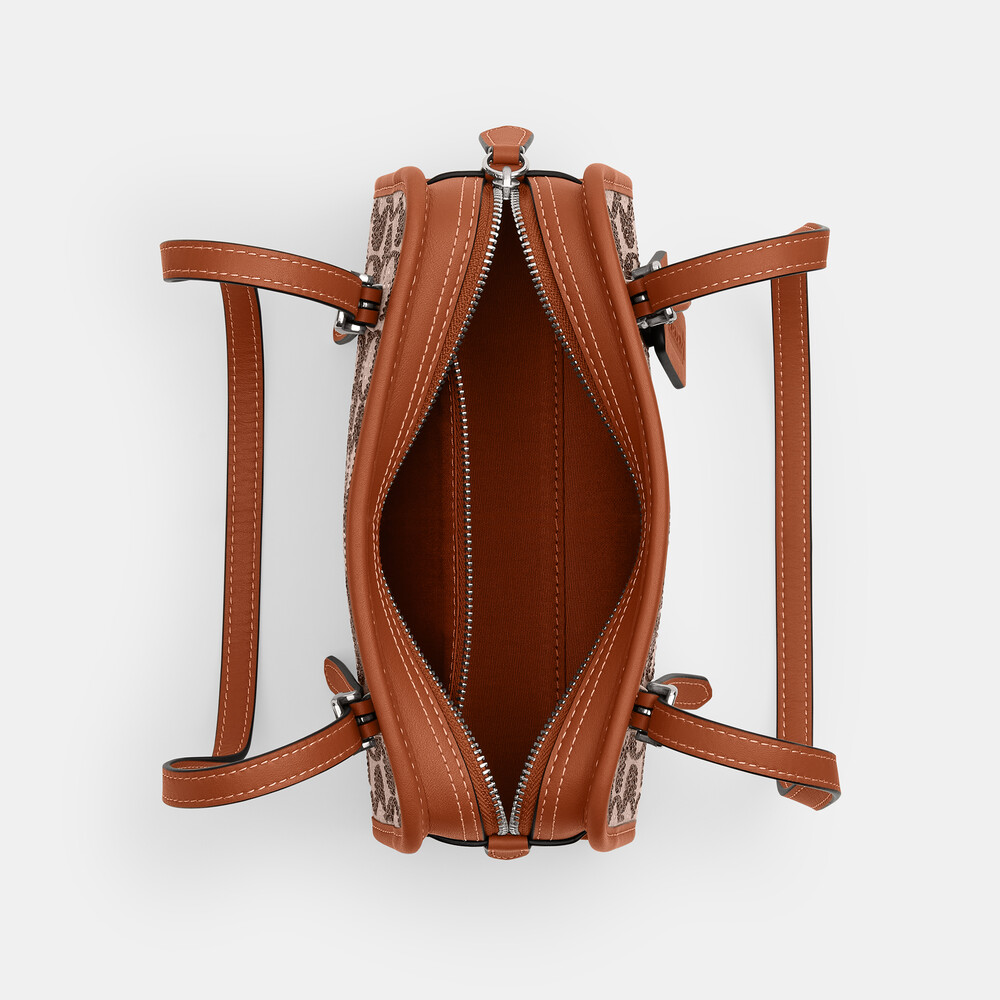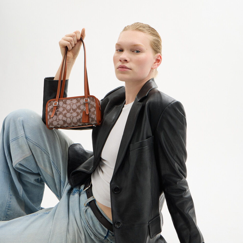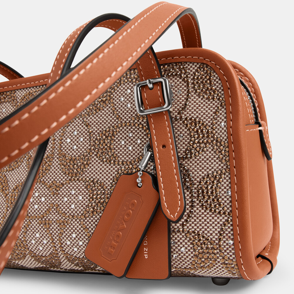 Signature jacquard and glovetanned leather Inside zip pocket Zip closure, fabric lining Adjustable handles with 25cm drop Four protective feet at base 20cm (L) x 11.5cm (H) x 8.5cm (W) The Coach OriginalsA slightly smaller version of the original, our compact Swing Zip Bag 20 is based on a 1998 Coach design reimagined for today. Crafted of glovetanned leather and our shimmery crystal-embellished Signature jacquard, the minimalist silhouette features an inside zip pocket, long adjustable shoulder straps for easy wear and protective feet at the base. Some styles are just too good to leave in the archives.