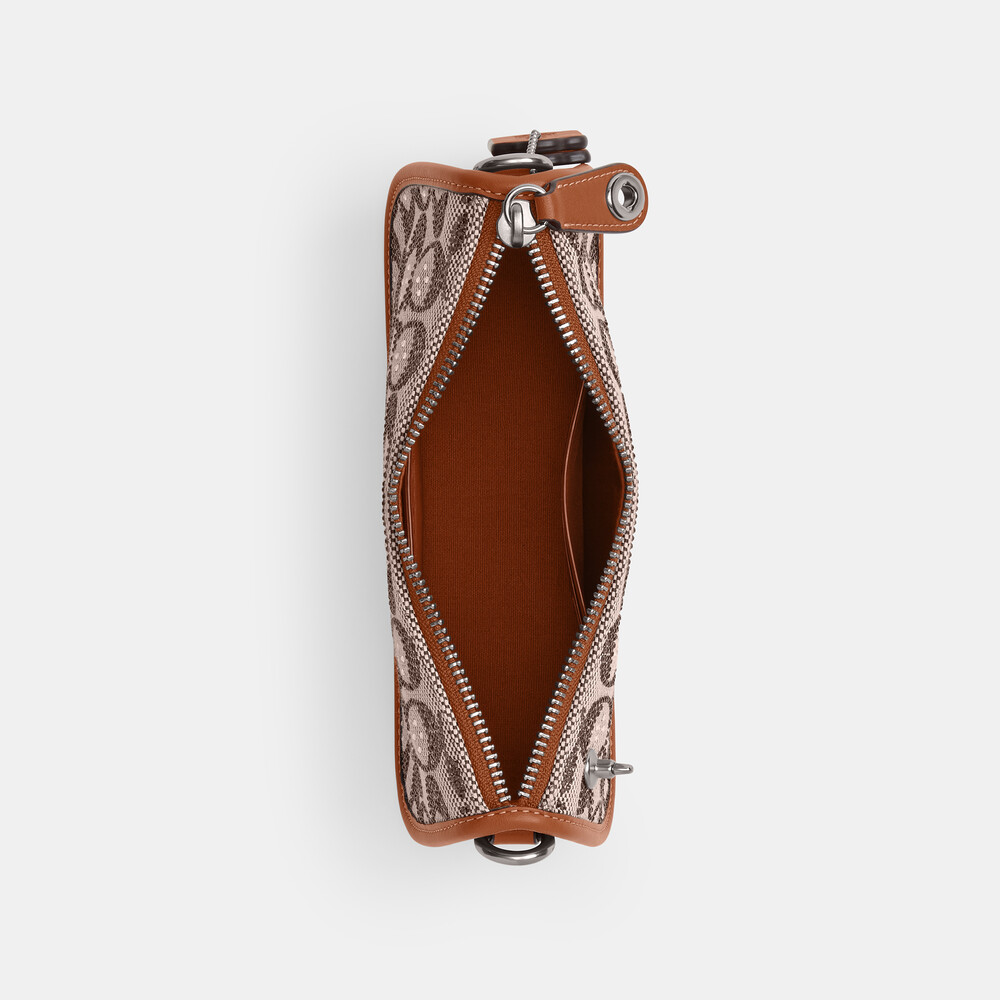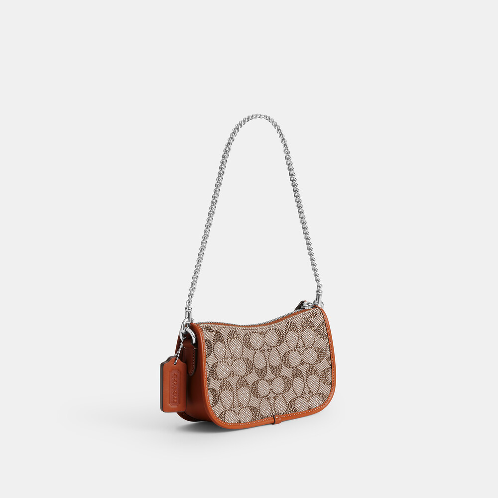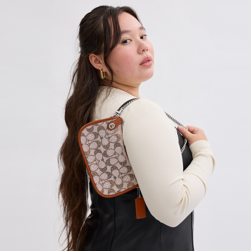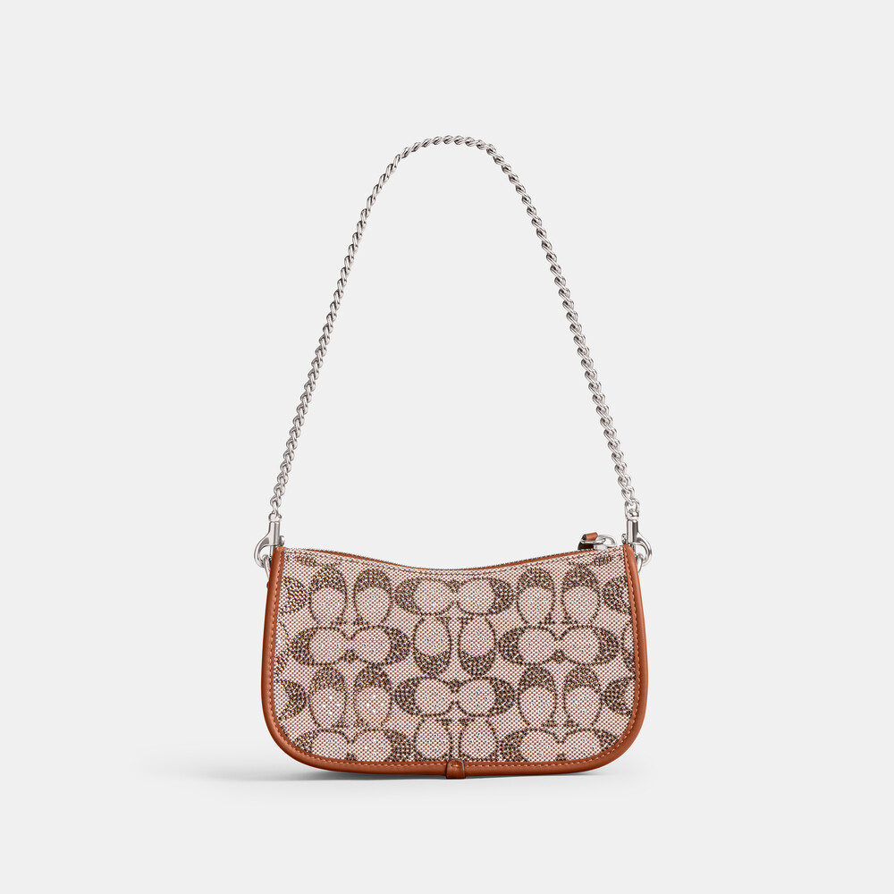 Signature jacquard and glovetanned leather Three credit card slots Zip-top closure, fabric lining Detachable chain handle with 19.5cm drop 20cm (L) x 12cm (H) x 6cm (W) The Coach OriginalsThe Swinger 20 Bag is part of The Coach Originals, a collection of archival-inspired bags that celebrates our legacy and authentic New York heritage. This streamlined glovetanned leather and shimmery crystal-embellished Signature jacquard style is based on a 1980s Coach design reimagined for today. Featuring our iconic turnlock closure, the petite bag sits just beneath the underarm with the short chain strap or it can be carried as a clutch. Some styles are just too good to leave in the archives.
