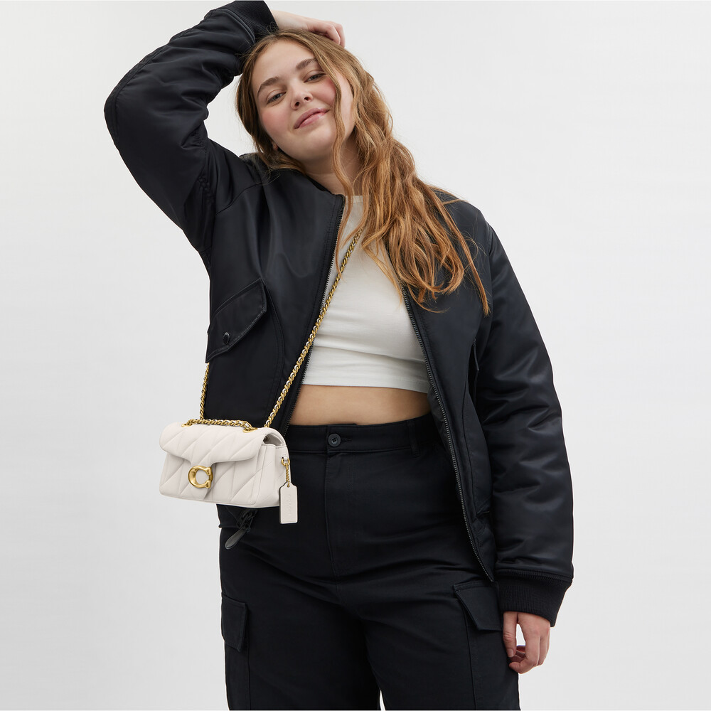 Nappa leather Inside magnetic snap pocket Pushlock closure, fabric lining Outside slip pocket Chain strap with 54.5cm drop for shoulder or crossbody wear 20cm (L) x 11cm (H) x 7cm (W)A modern take on an archival 1970s Coach design, our structured Tabby shoulder bag is crafted of quilted plush, ultra-soft nappa leather. Slightly smaller than the 26, the petite 20 features a long leather chain strap to wear crossbody or double up for a shorter, dressier look. It