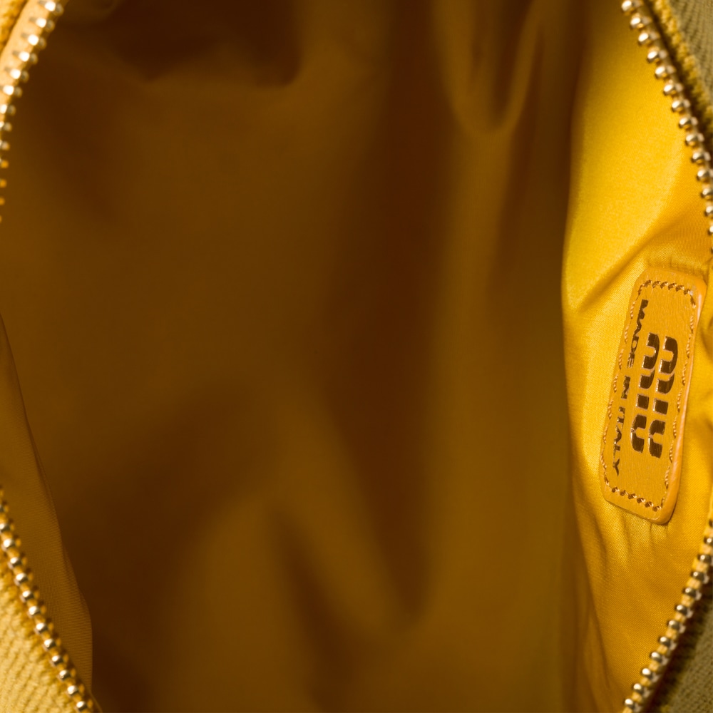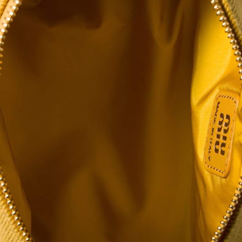 The lines of this pouch are sleeker thanks to the gabardine fabric and embroidered tonal logo, while the two-tone woven tape wristlet becomes an iconic element of Miu Miu style.