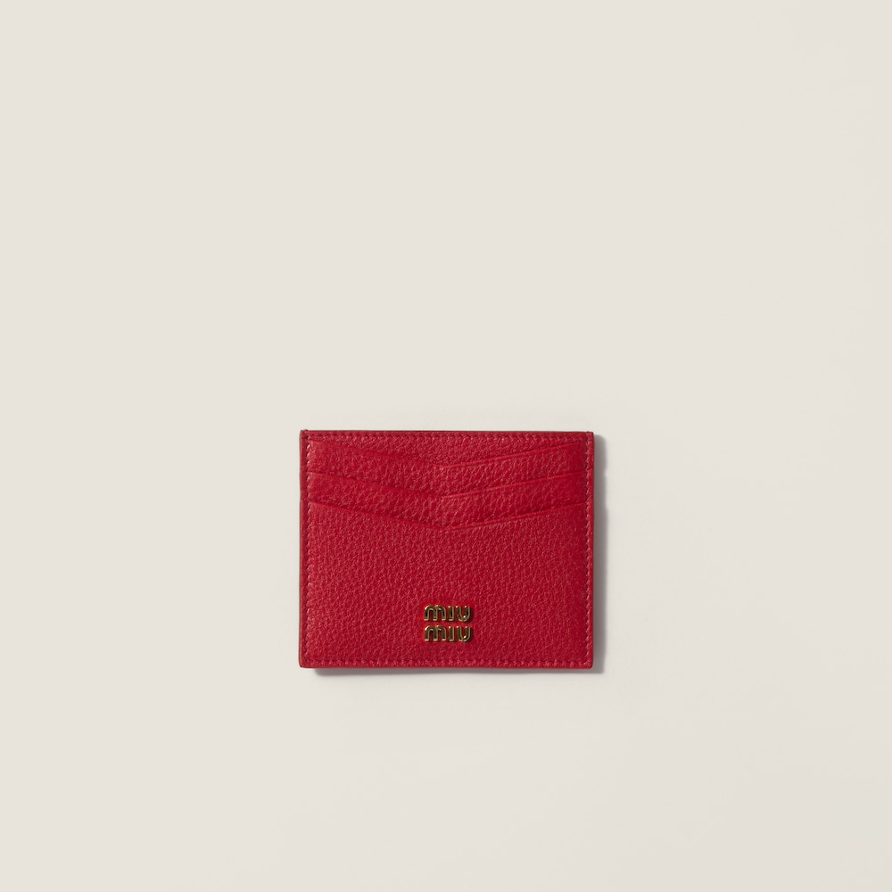 The sleek charm of this card holder is combined with the uniqueness of soft leather and the gold-tone metal logo that make the accessory a symbol of Miu Miu style.