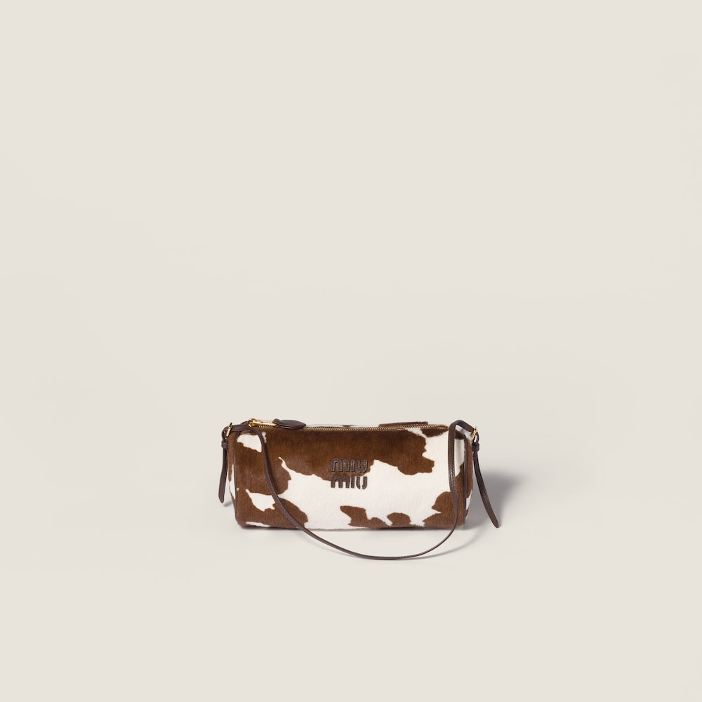 Versatile and essential, this pouch embodies the youthful, refined spirit of the Miu Miu wardrobe, standing out in its animal print variation, a bold blend of experimental flair and retro influences.