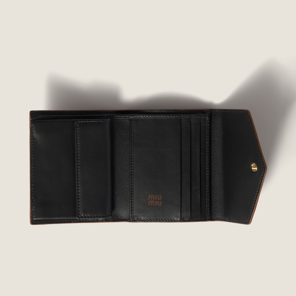 This sleek, compact wallet expresses its versatile elegance through the soft leather and logo detail on the clasp.