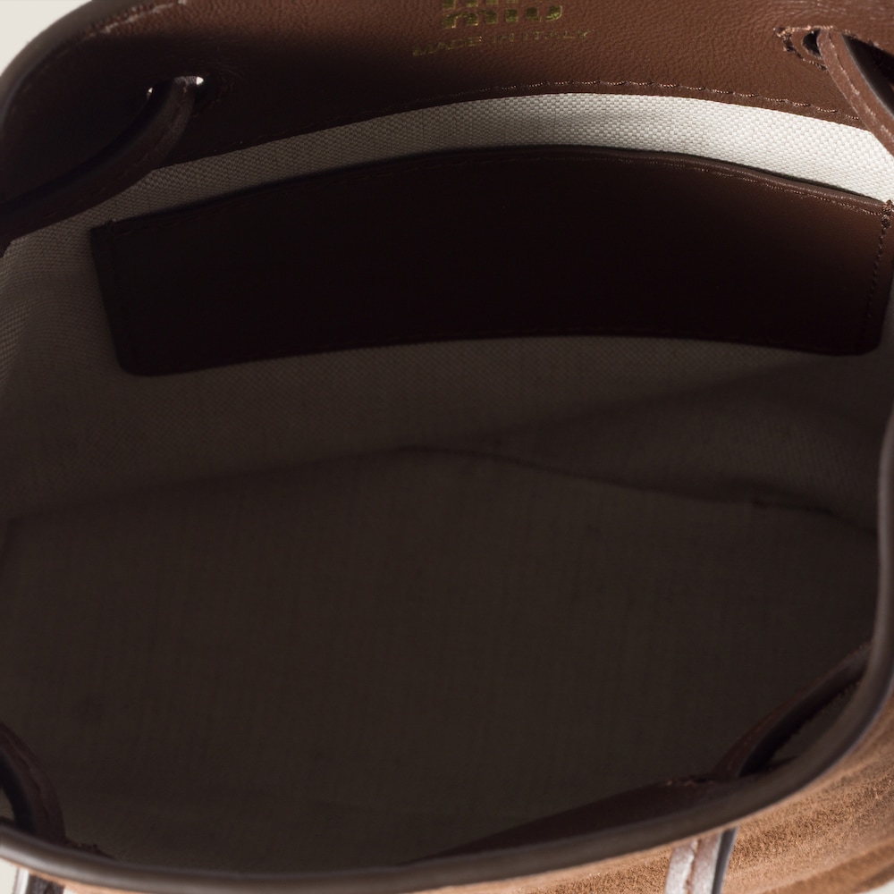 Vintage inspirations and a sleek design define this soft suede pouch, a distinctive element of Miu Miu's experimental wardrobe.