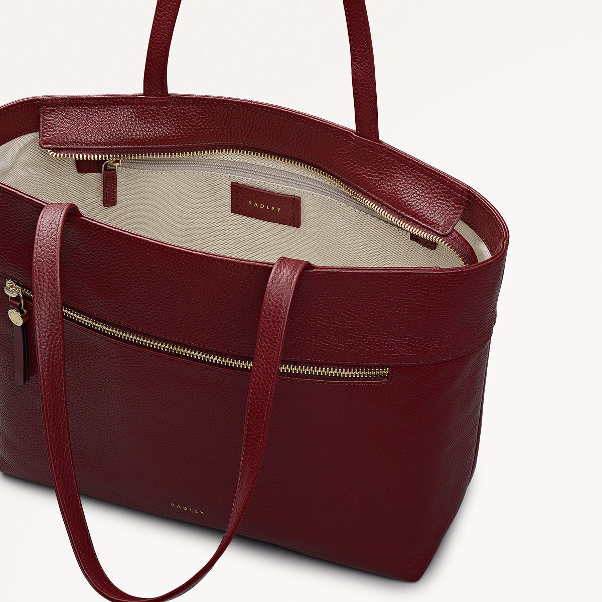 An update on a previous Radley collection, this Fountain Road tote features the same sleek and spacious design. It's crafted in grain leather with an east - west shape, slim handles and set down zipper closure with those signature long leather zip pullers.