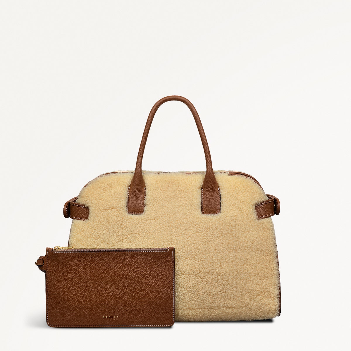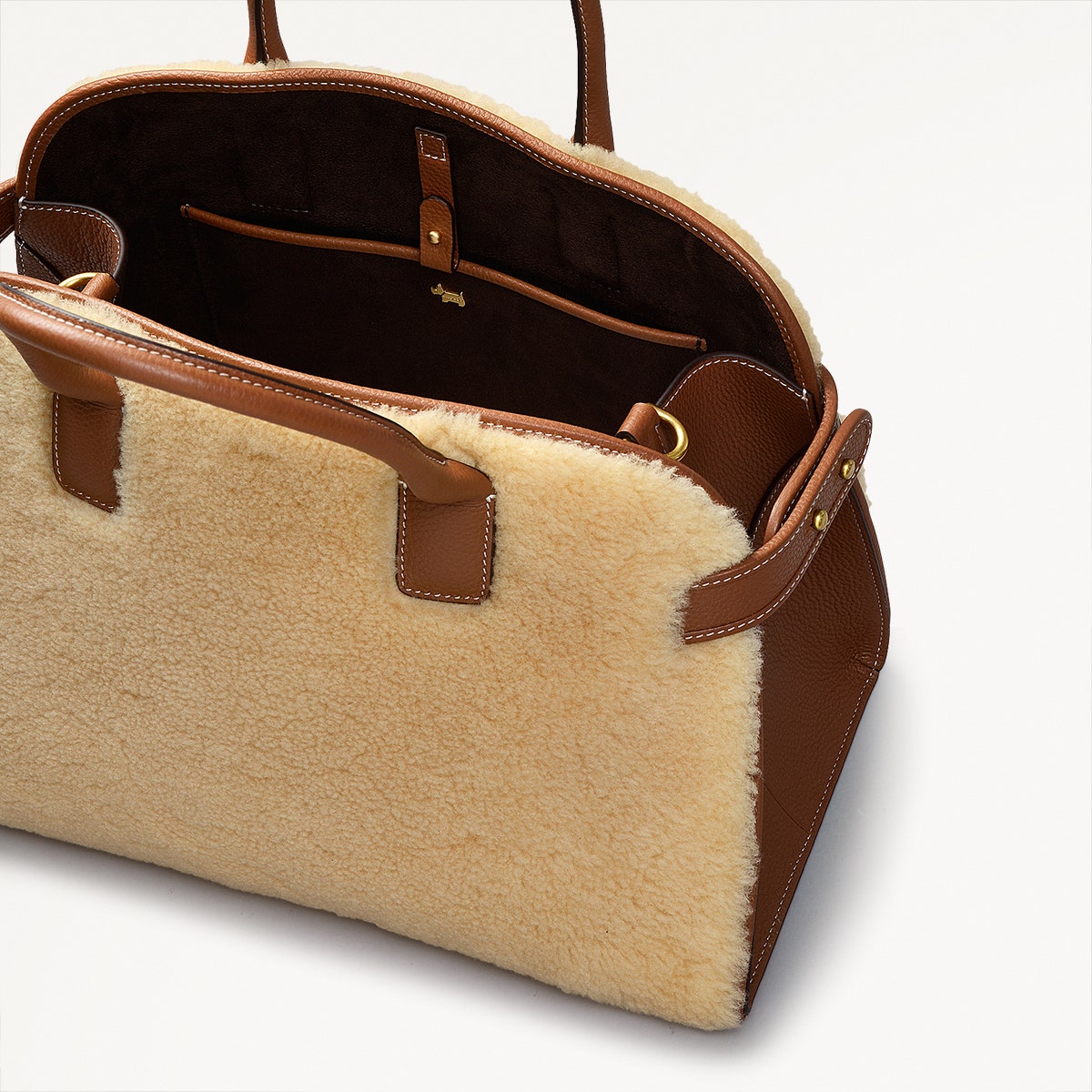 Where heritage style meets cozy shearling. The Rathbone grab bag gets an update with this new sumptuous texture and the signature grained leather trims. Designed with belted tabs, a detachable strap and interior zipped pouch, it still offers the practicality you need for any busy schedule.