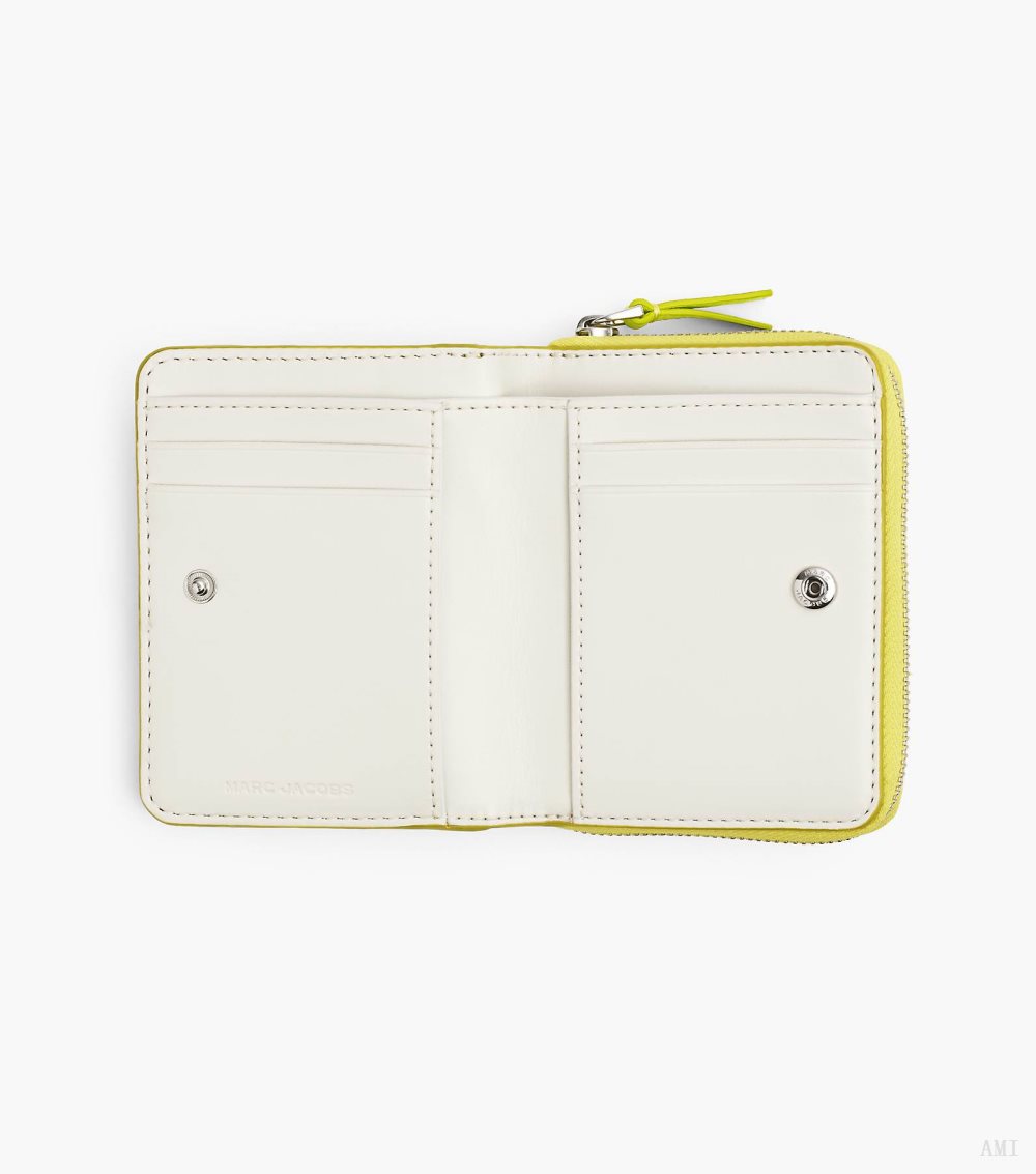 Look familiar? This mini compact wallet is designed with the same bold branding as our bestselling tote. Securing with a snap closure, it includes four card slots, one bill sleeve, two interior slip pockets, one coin pocket, and two exterior slip pockets. For a perfect Marc match, complete the set with one of our signature leather bags.2R3SMP044S10