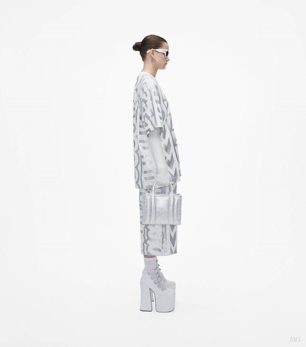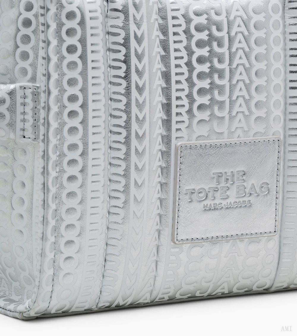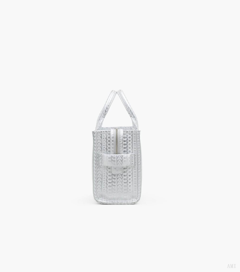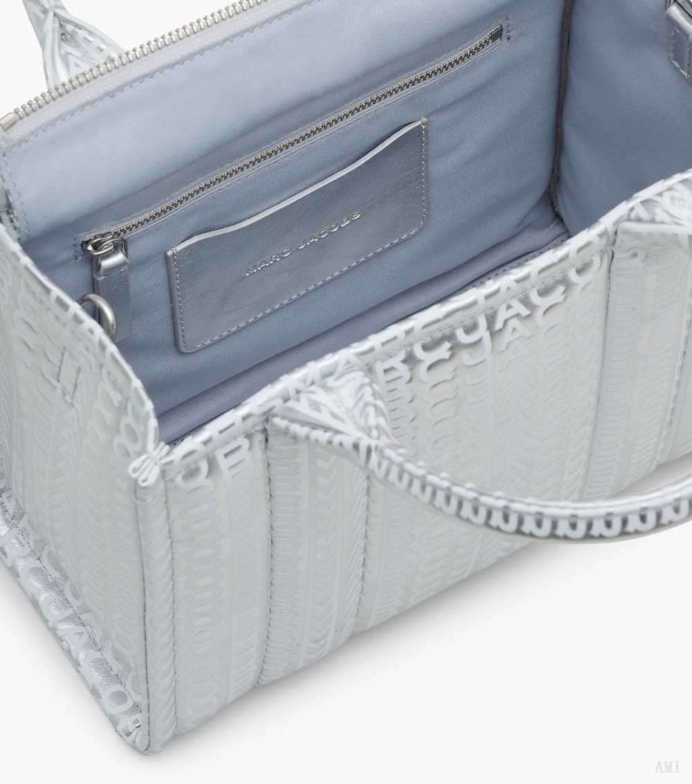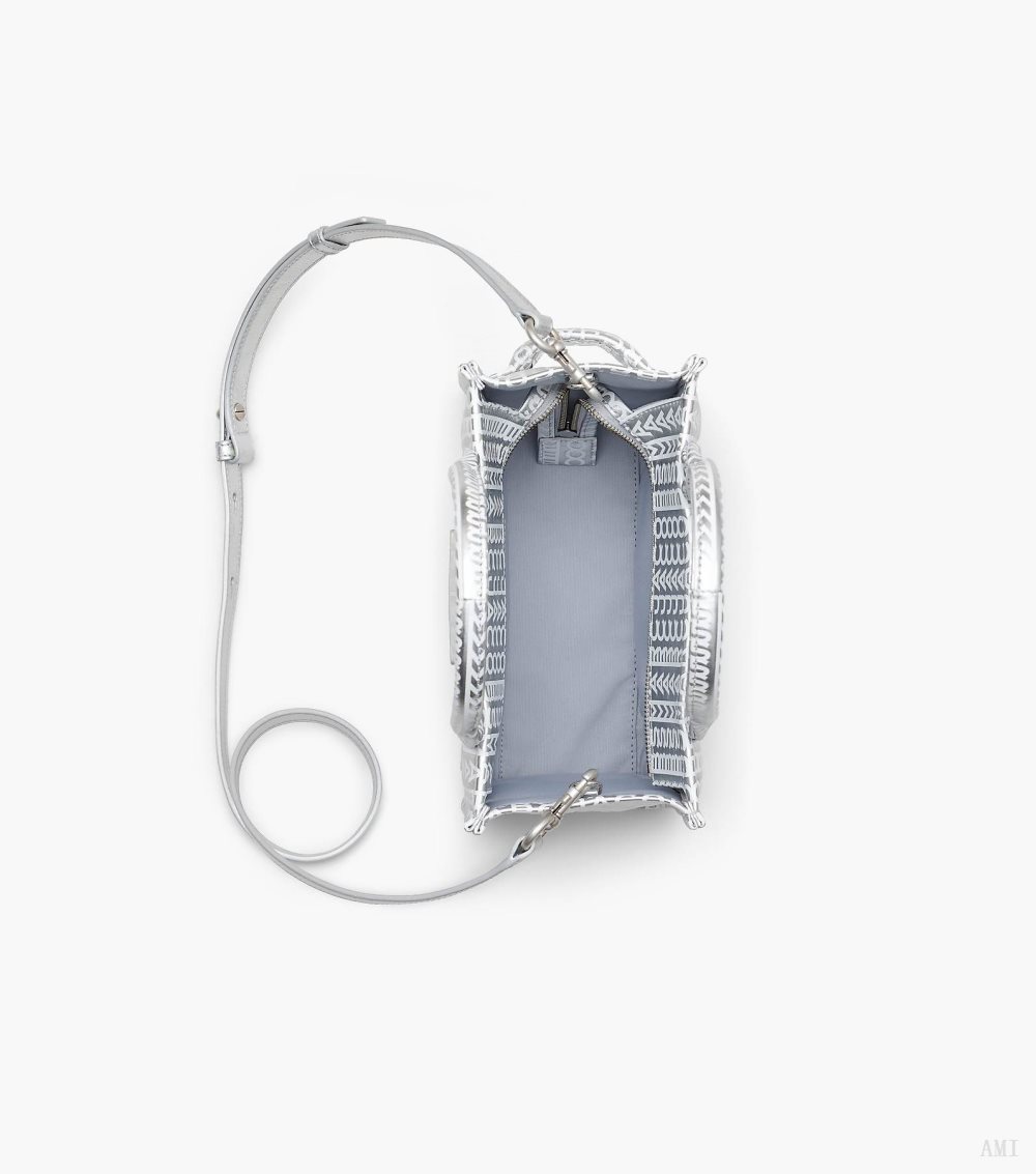 This striking version of our small tote bag is crafted in metallic silver leather and debossed with a microscale monogram pattern. It secures with a top zip closure and is finished with the iconic namesake branding at the front. Inside, it includes two slip pockets and one card slot. Carry at the top handles or attach the removable and adjustable leather strap to wear as a crossbody.2F3HTT049H01