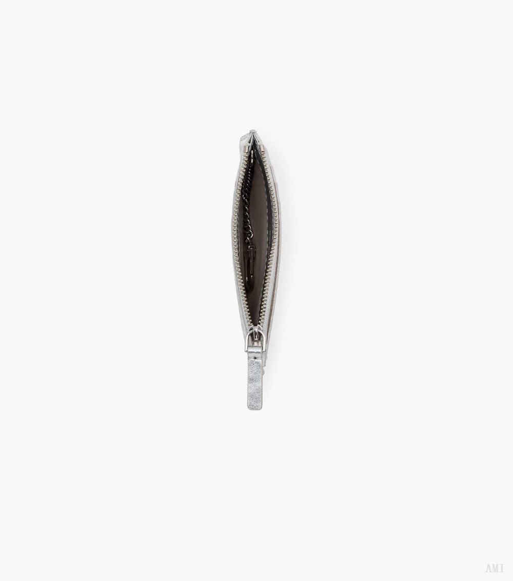 Striking metallic silver leather refreshes this monogram top zip wristlet wallet. It seals with a top-zip closure and includes four card slots, two front slip pockets, one top zip pocket, one chain with a key ring, and a removable wristlet strap. Pair back with the matching monogram metallic silver handbags to complete the set.2F3SMP035S07