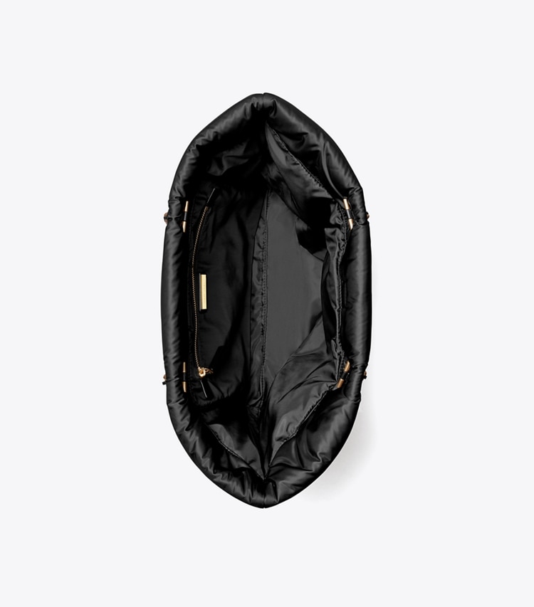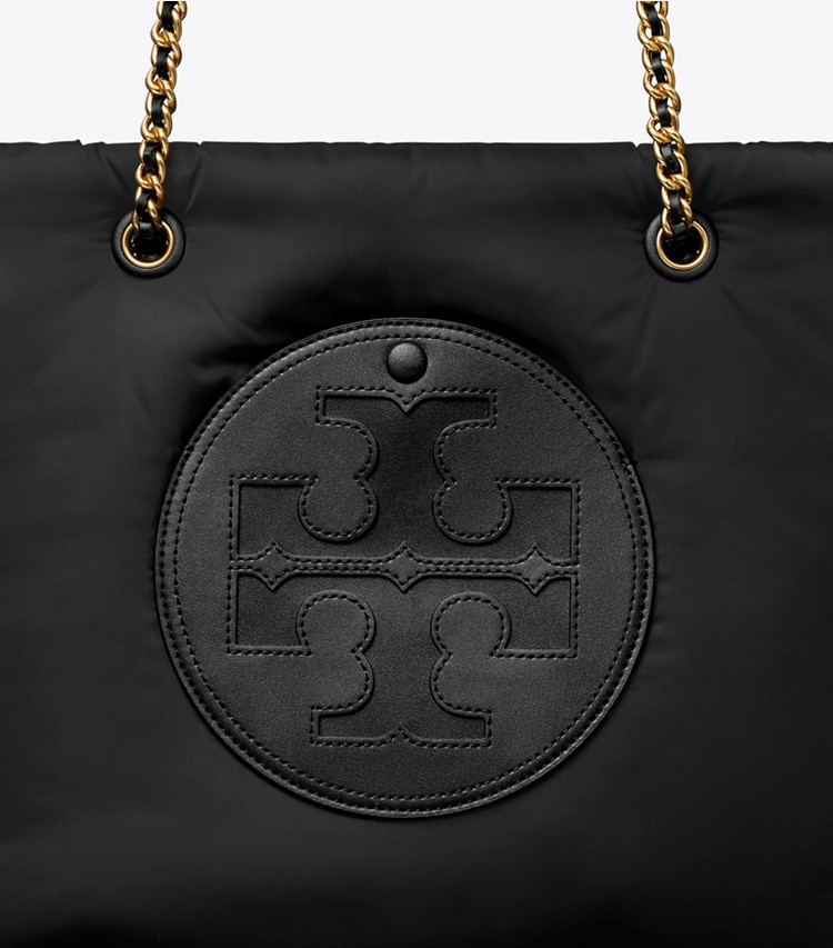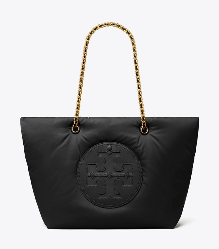 Instantly recognizable. The Ella Chain Soft Tote is made of featherweight recycled polyester with a braided chain strap. Ideal for every day, it has a roomy interior for all the essentials, including a laptop.?Height: 11.4" (29cm); length: 12.6" (32cm); depth: 6.3" (16cm)Outer shell: 100% recycled polyester; faux leather trimLining: 100% recycled polyesterMagnetic snap closureChain and leather interwoven shoulder straps with 10.4" (26.5cm) drop attached to leather wrapped toggles1 hidden exterior pocket on logo patch, 1 interior back wall zipper pocket