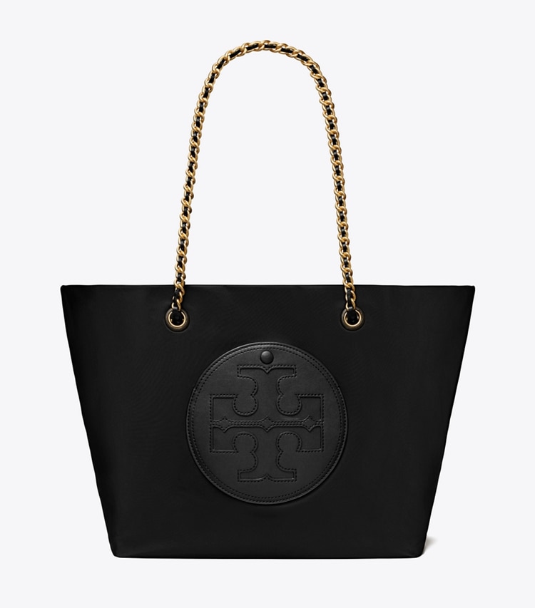 Instantly recognizable. The Ella Chain Tote is softly deconstructed in featherweight recycled nylon with a braided chain strap. Ideal for every day and getaways, it has a roomy interior for all the essentials, including a laptop.Height: 11.4" (29cm); length: 12.6" (32cm); depth: 6.3" (16cm)Fits a laptop up to 13"?Outer shell: 100% recycled nylon; faux leather trimLining: 100% recycled polyesterMagnetic snap closureChain and leather interwoven shoulder straps with 10" (25.5cm) drop attached to leather wrapped toggles1 hidden exterior pocket on logo patch, 1 interior back wall zipper pocket