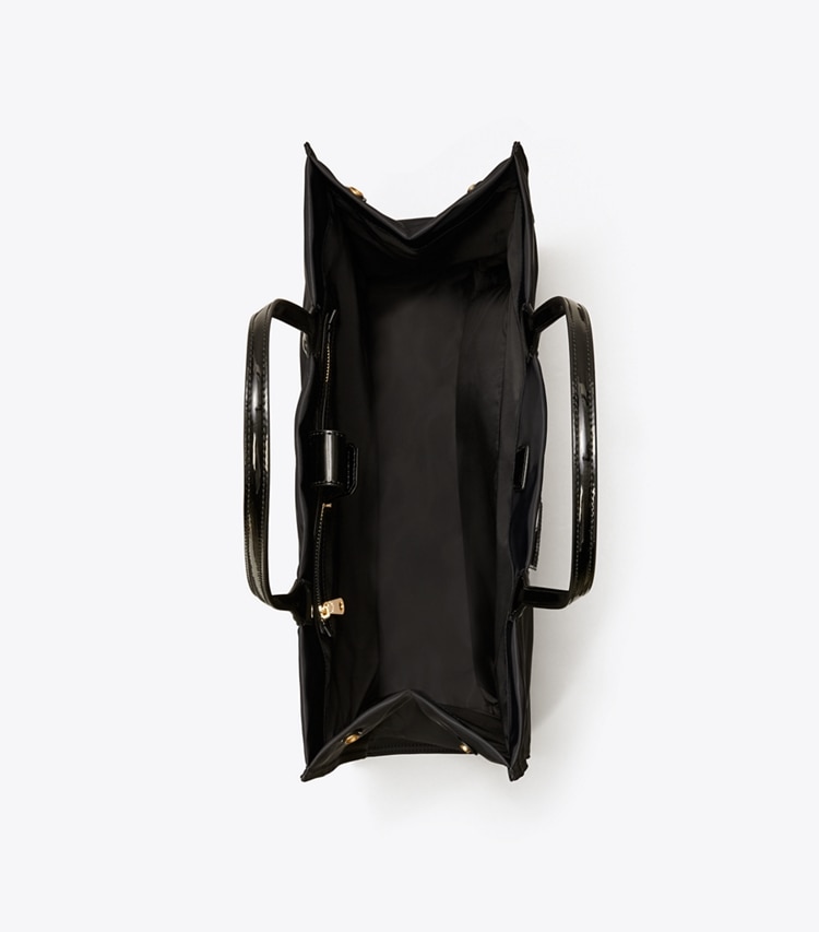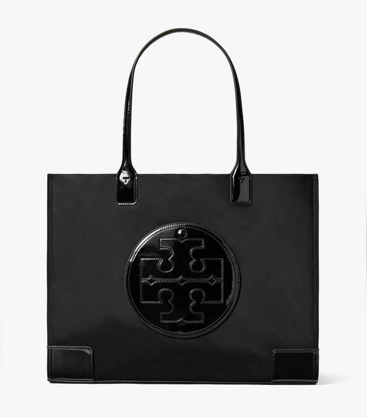 A perennial favorite, the Ella Tote Bag is made of durable recycled nylon with patent trim. Ideal for every day and getaways, it has a roomy interior for all your essentials.Height: 13" (33cm); length: 17.1" (43.5cm); depth: 5.1" (13cm)Fits a laptop up to 15"Recycled nylon; faux leather trimRecycled polyester liningBridge with hidden magnetic snap closure; snaps on gussetsTop handles with 9.1" (23cm) drop1 hidden exterior pocket on logo patch, 1 interior front wall slit pocket, 1 interior back wall zipper pocket