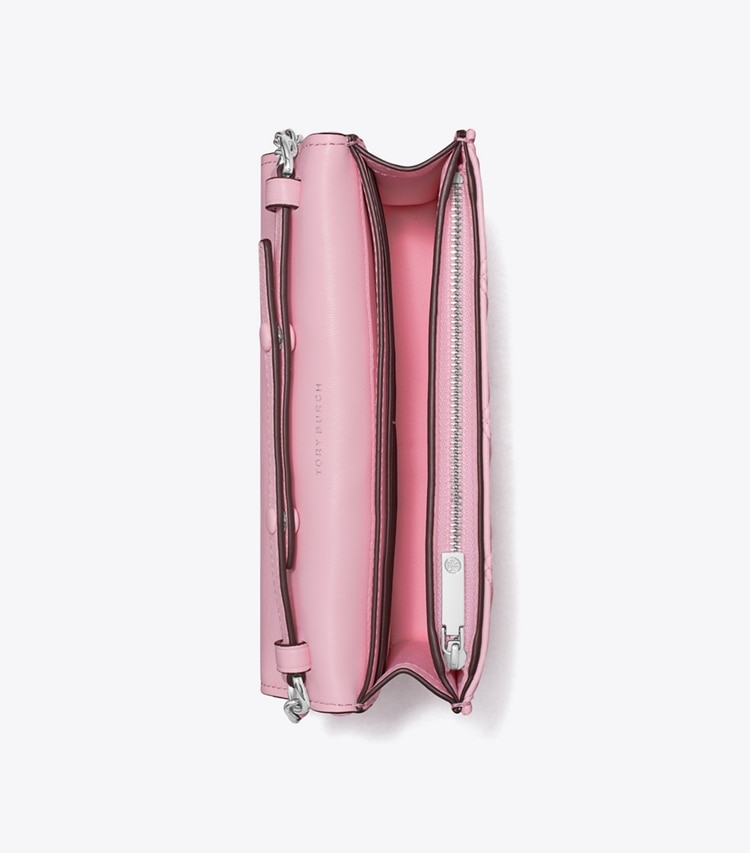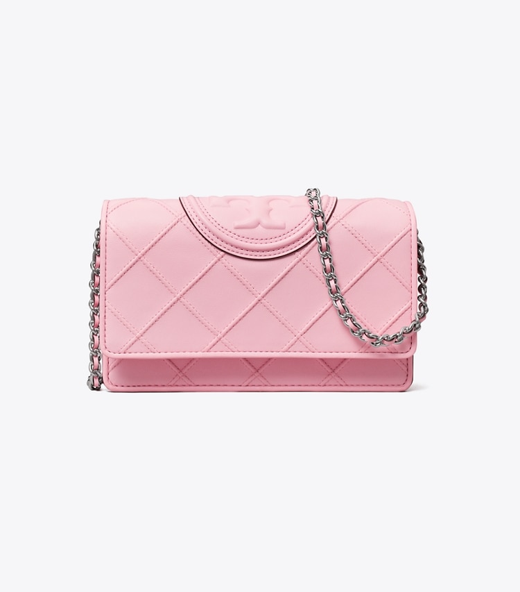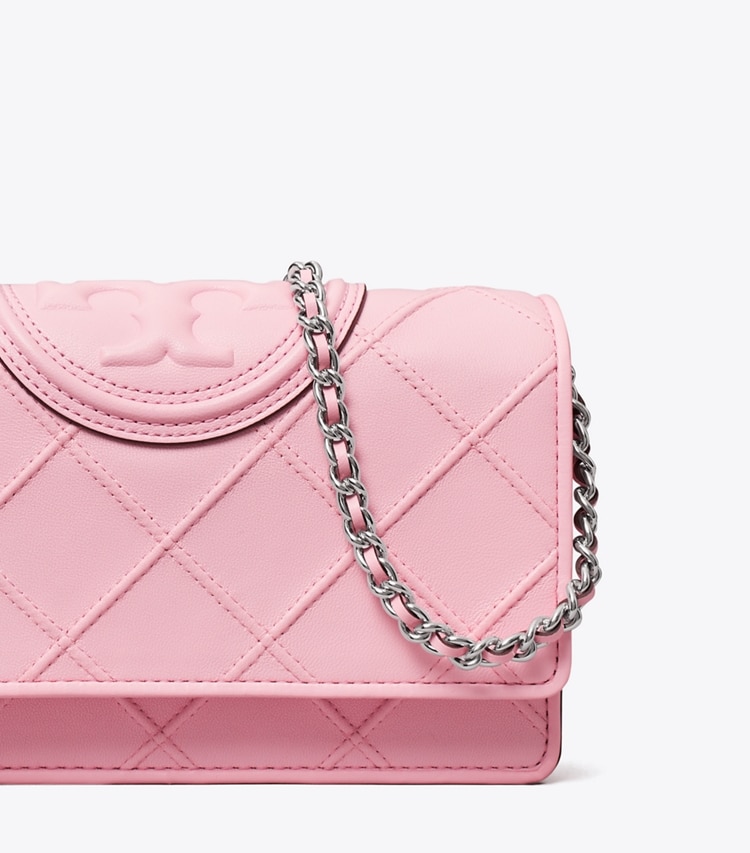 Enduring glamour. Diamond pintucks. Brushed gold chain, braided with leather. A feminine silhouette sealed with an oversized Double T. The Fleming Soft Chain Wallet is made of the softest leather, with pockets for cards, a phone and full-length bills.Height: 4.7" (11.8cm); length: 7.7" (19.5cm); depth: 1.4" (3.5cm)LeatherBrass hardwareFlap with magnetic snap closureChain and leather interwoven crossbody strap with 21.7" (55cm) drop1 exterior back slit pocket, 1 interior back wall bill pocket, 6 interior back wall card pockets, 1 interior zipper pocket