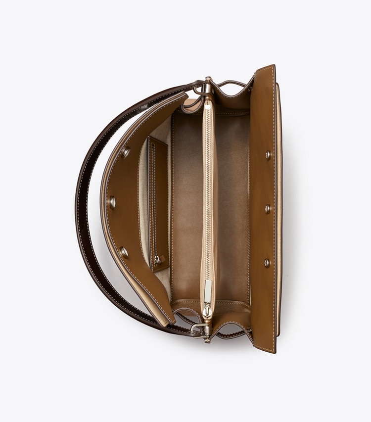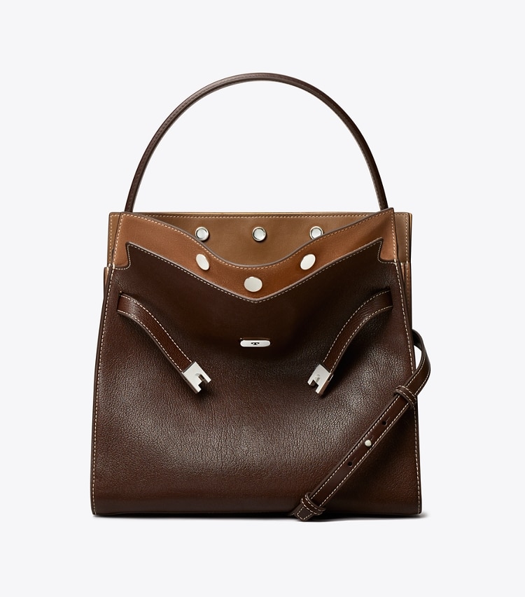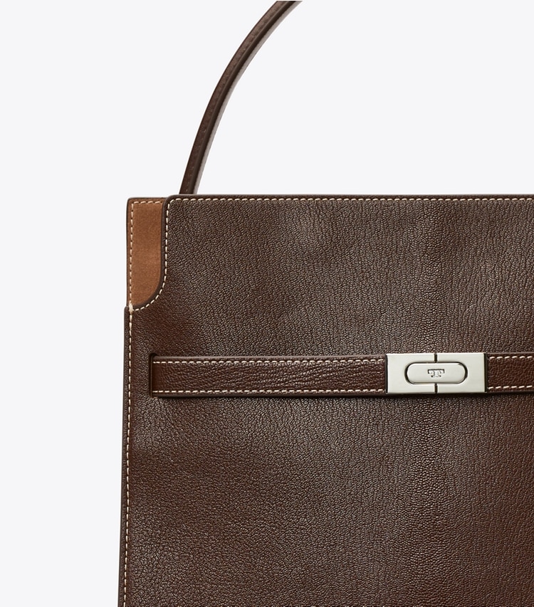 Our Lee Radziwill Double Bag contrasts structure and softness. Composed of layers that unfold like the collar of a trench coat, it can be worn open, semi-buttoned or fully closed. Beautifully crafted with signature lock-and-key hardware. The collection is named for Lee Radziwill, who was fearlessly unique.??Height: 11.8" (30cm); length: 12.4" (31.5cm); depth: 6.1" (15.5cm)Pebbled leather; suede and leather trimCotton herringbone liningSnap stud closure; belted strap with slider buckleLeather top handle with 5.9" (15cm) drop; adjustable, removable shoulder strap with 14.2" (36cm) drop1 interior top zipper compartment, 1 interior back wall zipper pocket on 1 slit pocketHanging key charmProtective metal feetDust bag included