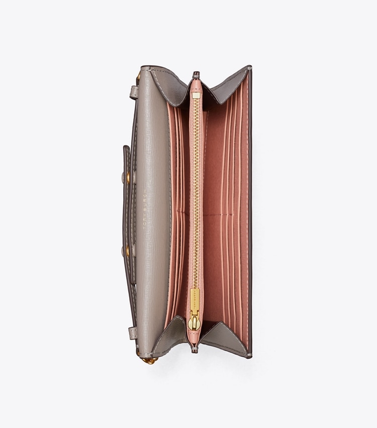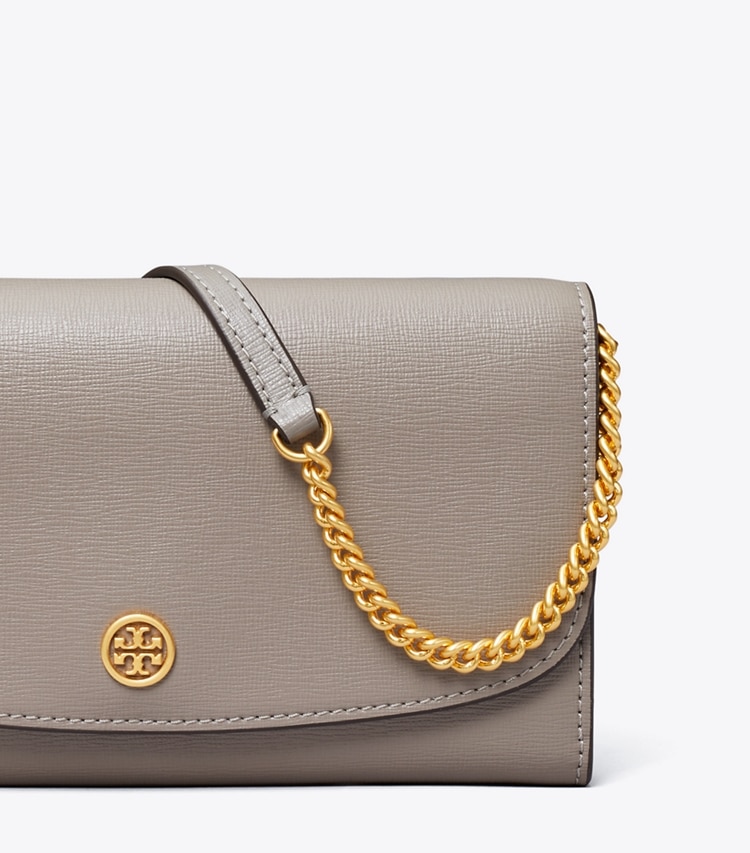 A collection named for Tory's parents, Buddy and Reva Robinson. Inspired by their love of travel, the timeless and versatile silhouettes are designed for everyday use. The Robinson Chain Wallet is made of the highest-quality, scratch-resistant leather, updated with new rounded edges.?Height: 4.5" (11.5cm); length: 8.1" (20.5cm); depth: 1.4" (3.5cm)Saffiano leatherFlap with magnetic snap closureAdjustable chain and leather crossbody strap with 22.2" (56.5cm) drop1 interior back wall bill pocket, 1 center zipper pocket, 12 card pockets
