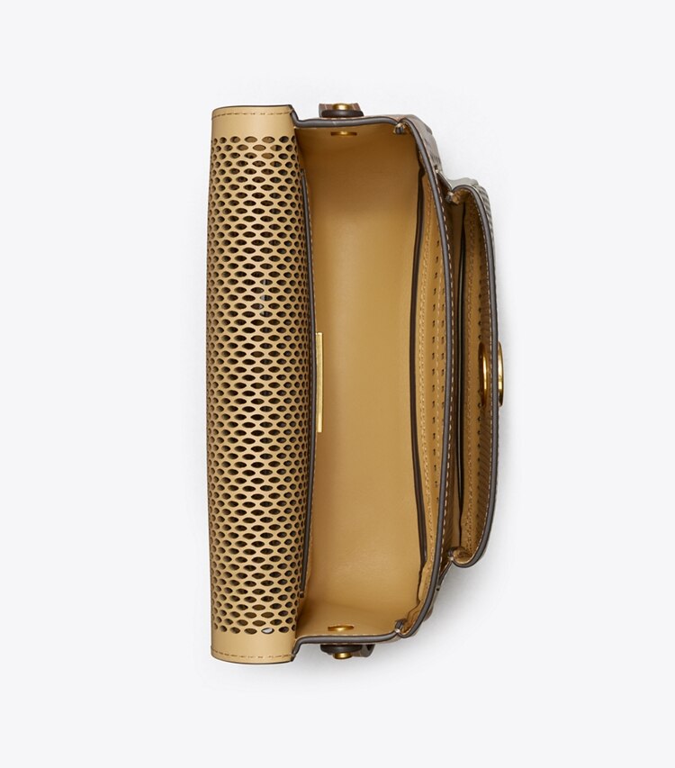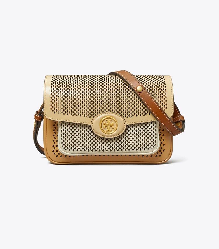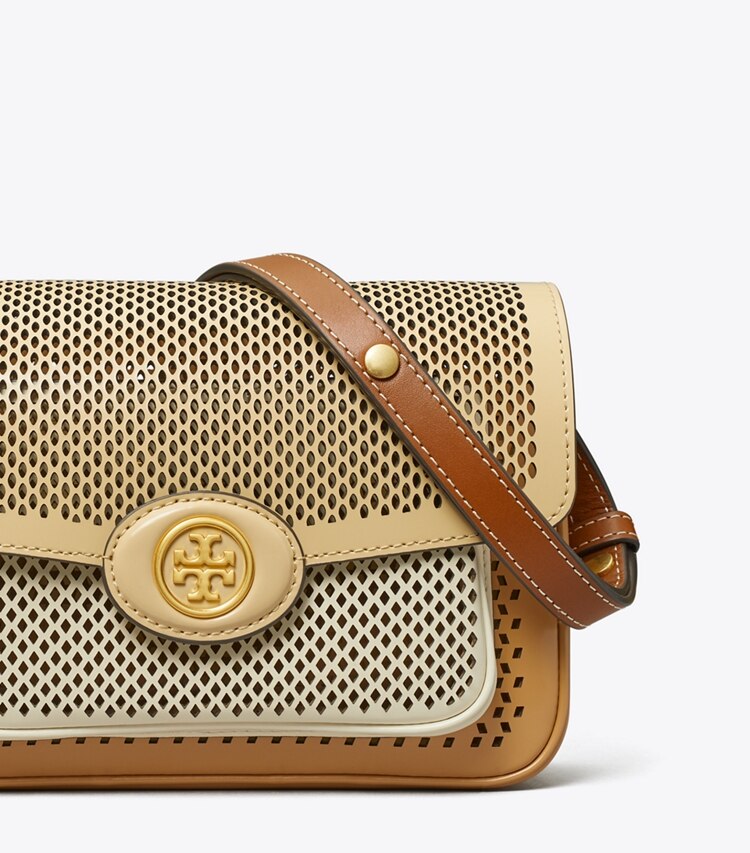 A collection named for Tory's parents, Buddy and Reva Robinson. Inspired by their love of travel, the timeless and versatile silhouettes are designed for everyday use. The Robinson Convertible Shoulder Bag is made of colorblocked perforated leather with smooth rounded edges.?Height: 6.1" (15.5cm); length: 8.3" (21cm); depth: 2.4" (6cm)Perforated leather; leather trimFlap with magnetic snap closureAdjustable shoulder strap with 9.8" (25cm) drop1 exterior front pocket under flap, 1 exterior back slit pocket,, 1 interior slit pocketDiamond perforation techniqueDust bag included