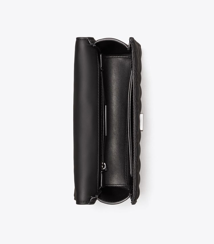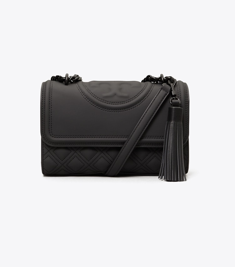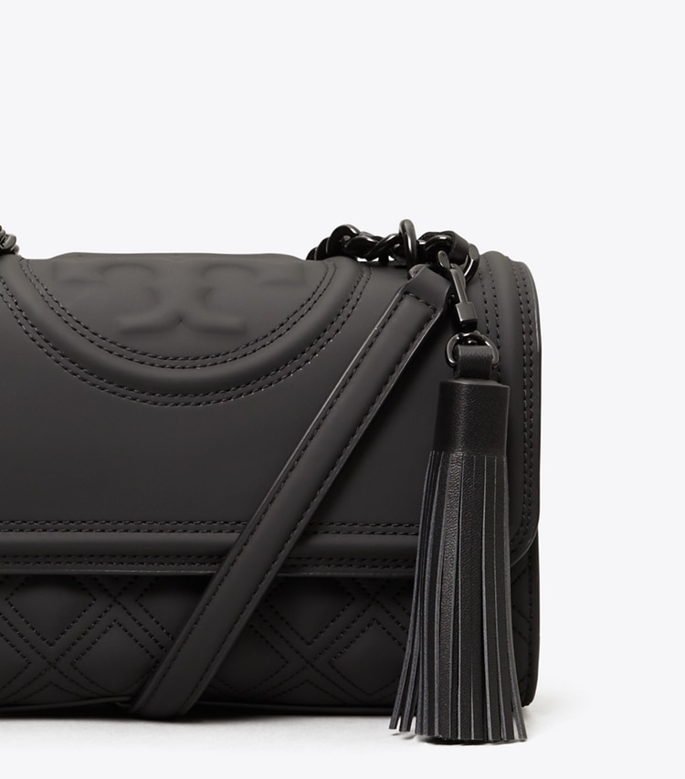 The new Fleming: a matte design with bolder diamond quilting and an embossed bombe Double T. The strap has a shoulder guard for comfort and is braided with tonal chain. It is convertible, so you can wear it short or long. Exclusively available at toryburch.com and in our boutiques.Height: 5.3" (13.5cm); length: 8.3" (21cm); depth: 2.6" (6.5cm)Rubberized PUFlap with magnetic snap closureConvertible chain and leather interwoven shoulder strap with 22.2" (56.5cm) drop: leather shoulder guard for comfort1 exterior back slit pocket, 2 interior pockets, 1 interior zipper pocketClip on leather tasselDust bag included