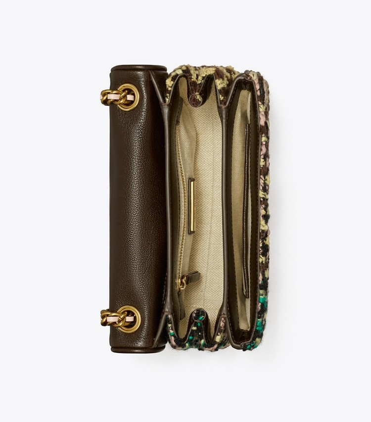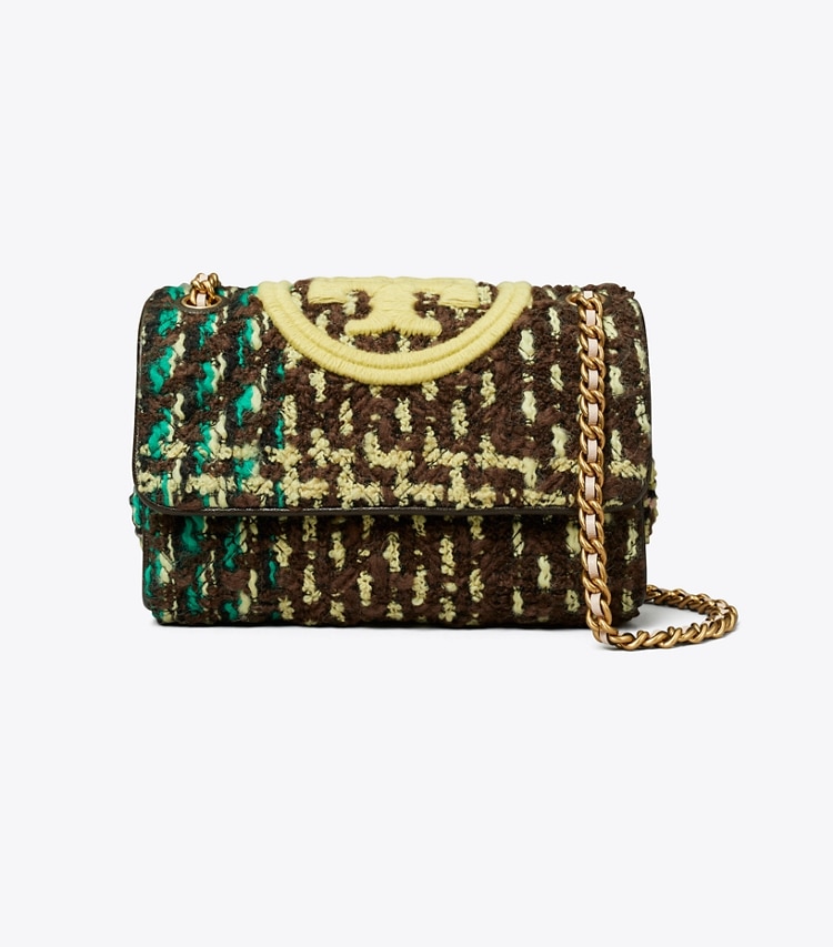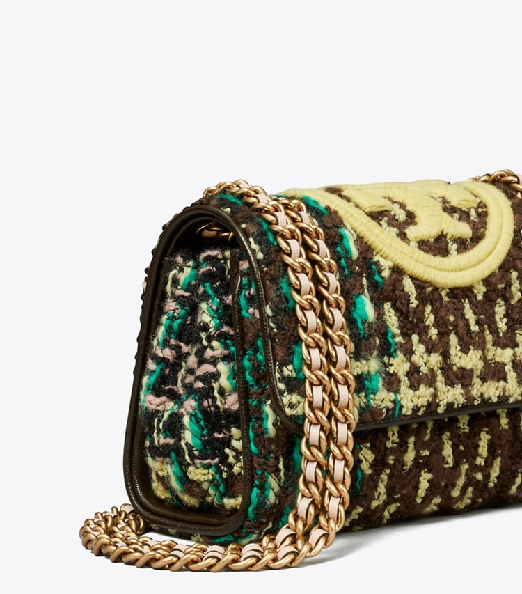 Beautifully crafted in colorful tweed, the Small Fleming Soft Tweed Convertible Shoulder Bag is sealed with an embroidered Double T. Braided with brushed gold chain, the convertible strap can be worn long or short.?Height: 5.7" (14.5cm); length: 8.7" (22cm); depth: 3.2" (8cm)Tweed; tumbled leather trimCotton herringbone liningFlap with magnetic snap closureConvertible chain and leather interwoven strap with 22.2" (56.5cm) drop1 interior front slit pocket, 1 interior zipper pocketQuilting technique