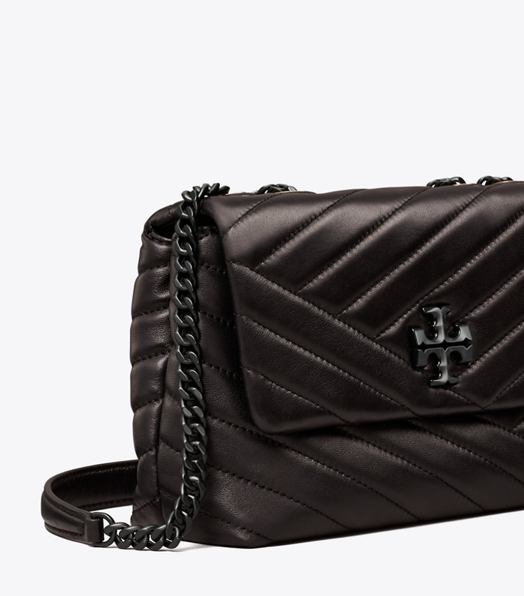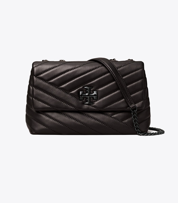 The Small Kira Convertible Shoulder Bag plays with tonal texture: powder-coated hardware on soft chevron-quilted leather. An adjustable chain strap adapts in the moment