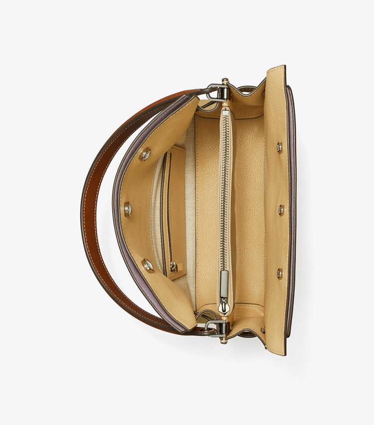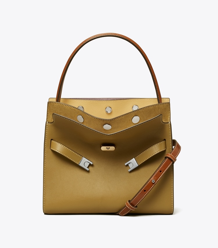 Our Small Lee Radziwill Colorblock Double Bag contrasts structure and softness. Composed of layers that unfold like the collar of a trench coat, it can be worn open, semi-buttoned or fully closed. Beautifully crafted with signature lock-and-key hardware. The collection is named for Lee Radziwill, who was fearlessly unique.??Height: 9.5" (24cm); length: 10.6" (27cm); depth: 4.7" (12cm)Calf leather; suede and leather trimCotton herringbone liningSnap stud closure; belted strap with slider buckleLeather top handle with 5.9" (15cm) drop; adjustable, removable shoulder strap with 14.2" (36cm) drop1 interior top zipper compartment, 1 interior back wall zipper pocket on 1 slit pocketHanging key charmProtective metal feetDust bag included