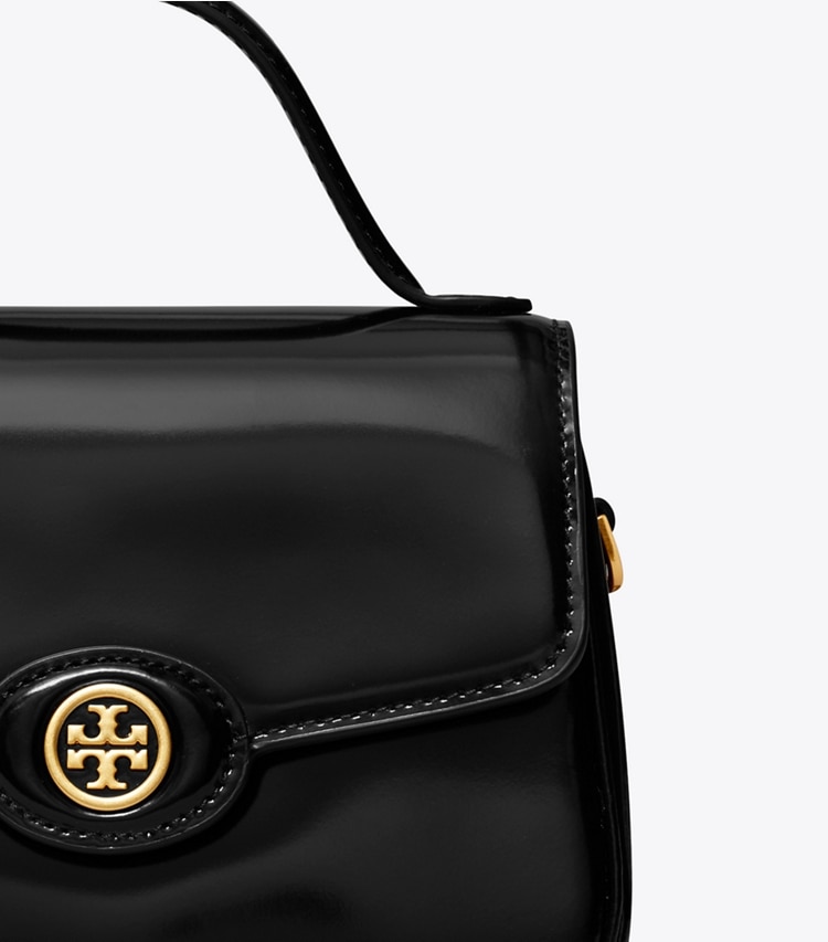 A collection named for Tory's parents, Buddy and Reva Robinson. Inspired by their love of travel, the timeless and versatile silhouettes are designed for everyday use. The Small Robinson Top-Handle is made of beautiful spazzolato leather with smooth rounded edges. Carry it by hand or wear it with the removable crossbody strap.?Height: 5" (12.8cm); length: 7.1" (18cm); depth: 2.2" (5.5cm)Patent leatherMicrofiber lining with a suede-like finishBrass hardwareFlap with magnetic snap closureTop handle with 2.4" (6cm) drop; adjustable, removable crossbody strap with 20.9" (53cm) drop1 interior slit pocketDust bag included