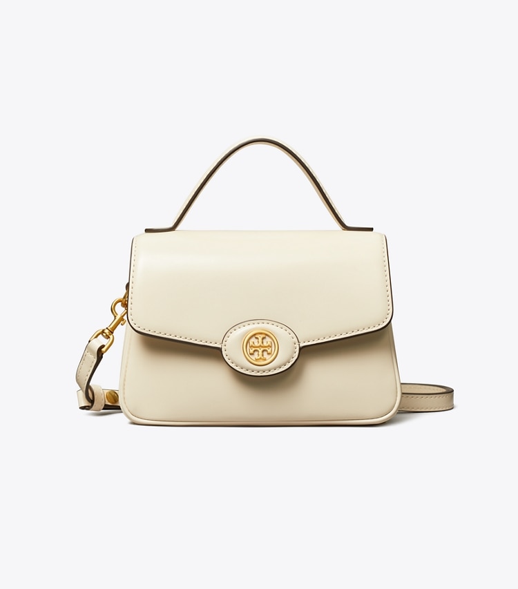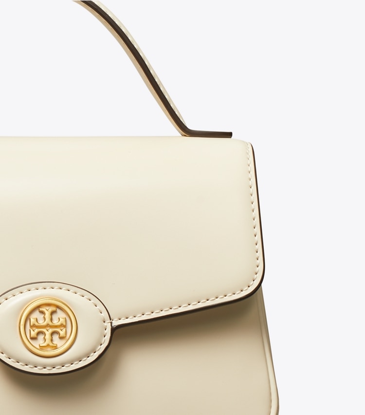 A collection named for Tory's parents, Buddy and Reva Robinson. Inspired by their love of travel, the timeless and versatile silhouettes are designed for everyday use. The Small Robinson Top-Handle Bag is crafted in beautiful spazzolato leather and has pockets for everything, including a smartphone. Carry it by the crossbody strap or top handles.Height: 5" (12.8cm); length: 7.1" (18cm); depth: 2.4" (6cm)Calf leatherMicrofiber lining with a suede-like finishFlap with magnetic snap closureTop handle with 2.4" (6cm) drop; adjustable, removable shoulder strap with 12.4" (31.5cm) drop1 interior slit pocketDust bag included