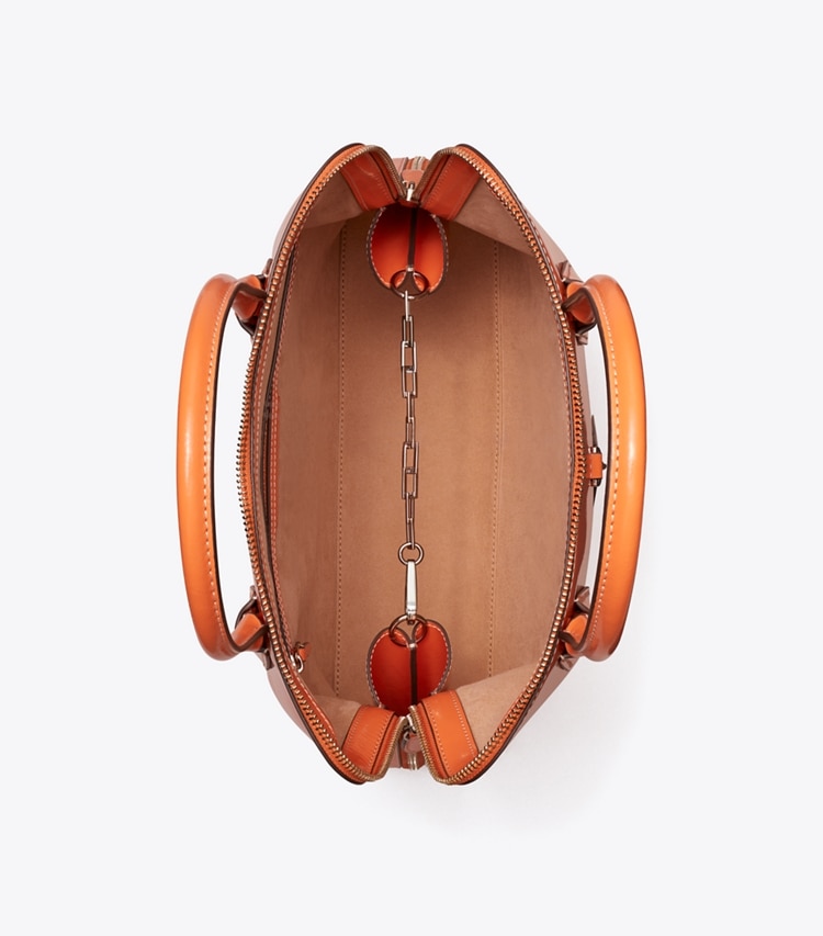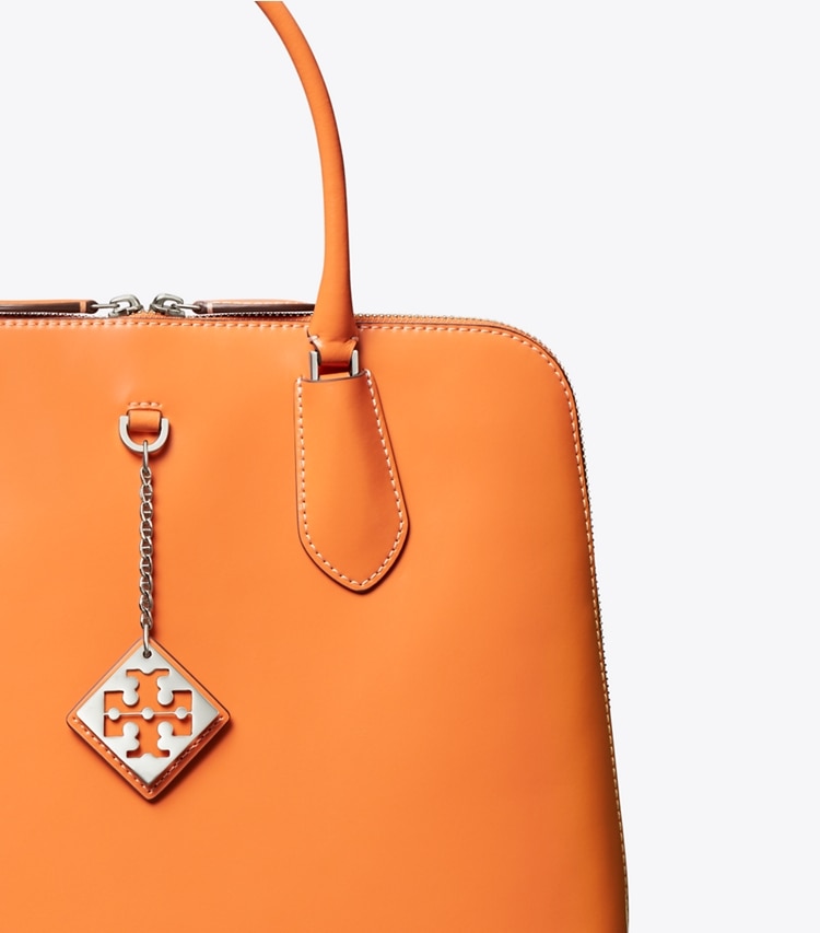 Seen on the SS23 runway. A ladylike take on the classic doctor bag, our Swing Satchel has tubular top handles, a full zipper and graphic white gold hardware. The perfect modern work bag, both roomy and lightweight, with an authoritative elegance.?Height: 10.4" (26.5cm); length: 12.6" (32cm); depth: 4.1" (10.5cm)LeatherCotton liningShiny palladium hardwareZipper closure; interior chain with dog clipTop handles with 5.5" (14cm) drop; adjustable, removable shoulder strap with 20.5" (52cm) drop1 interior back wall zipper pocketHanging logo charmProtective metal feetDust bag included