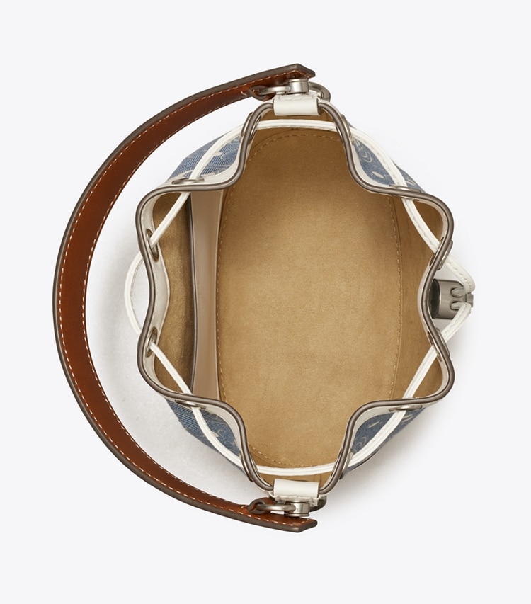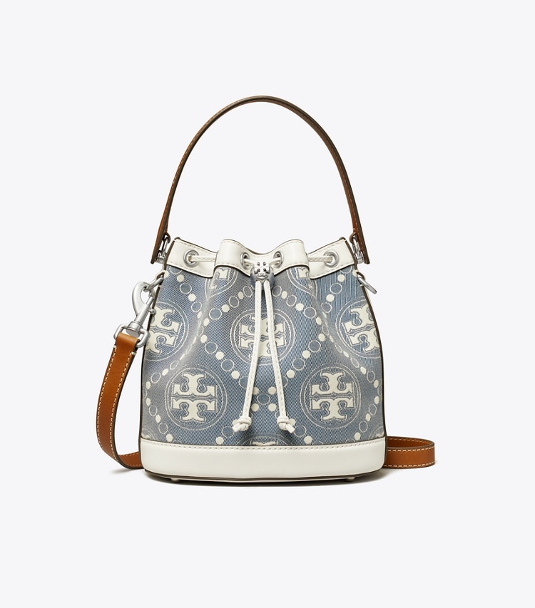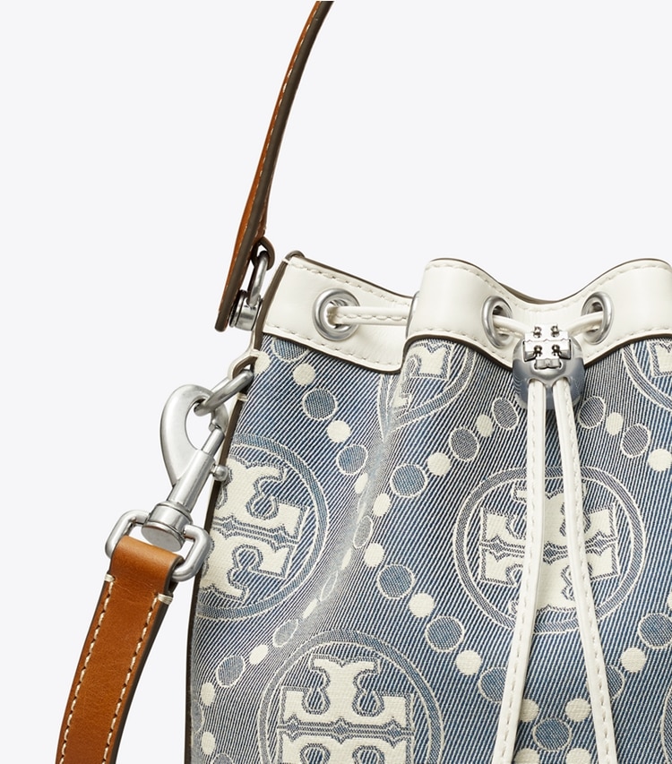 The T Monogram is a classic pattern inspired by traditional Pennsylvania Dutch quilting. Meticulously crafted in denim jacquard, the collection speaks to the timelessness of great style.? The bucket bag is trimmed in fine leather. When worn crossbody, the top handle falls naturally. Our metal logo cord stopper works as a keeper for the drawstrings. Press and hold the Double T down while guiding the drawstrings through